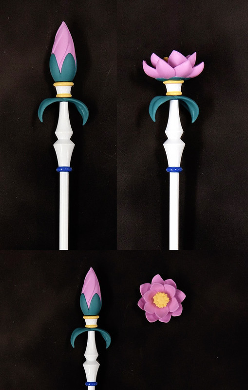 在配件部份則有表演「花鳥風月」的兩把噴水扇子、頂端花朵可替換開/閉狀態的「阿克婭智之杖」以及滿懷女神憤怒與悲傷的必殺拳「神光拳(ゴッドブロー)」特效零件,至於裙底下是不是「NO胖」就要等到發售後自己揭曉啦~!