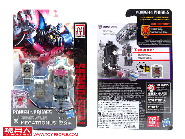 ▼「密卡托納斯」(Megatronus),黑暗的戰士,主掌了混亂與渾沌。在馬克西莫大帝(Liege Maximo)的挑撥下誤殺所愛,而後自我放逐成為尤尼克隆(Unicron)的使徒-「墮落」(Fallen)。本次的玩具是以隱者戰士「彈爆/血魔」(Bomb-Burst/Blood)的蝙蝠型魔怪作為基礎所製。