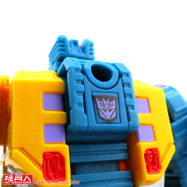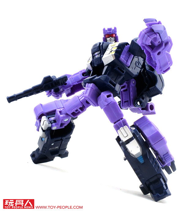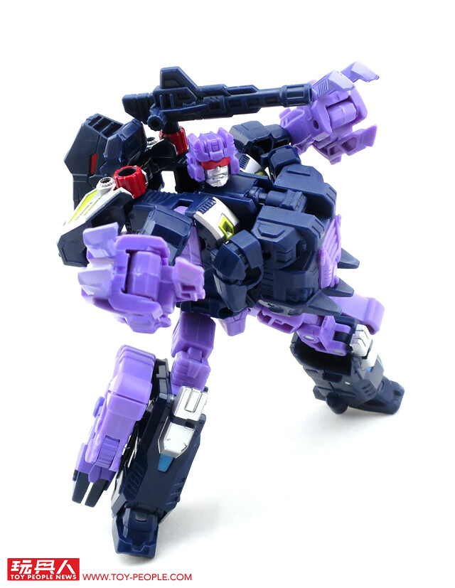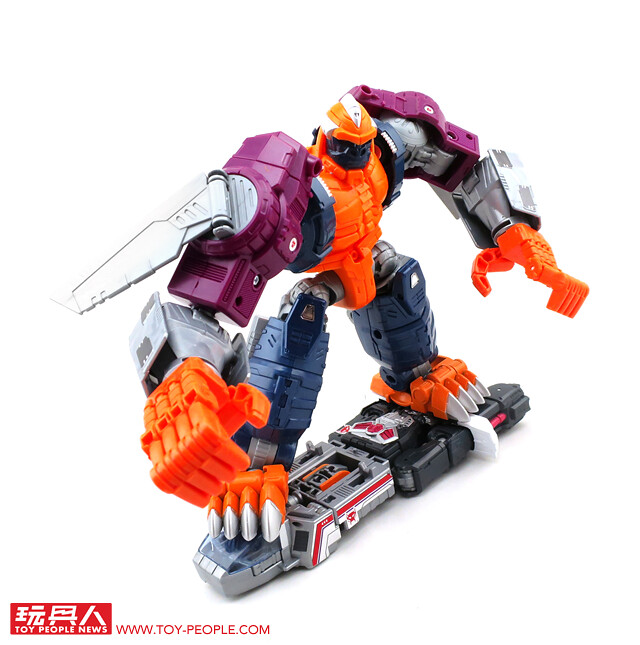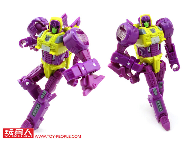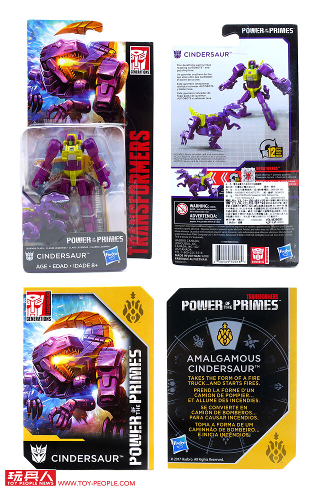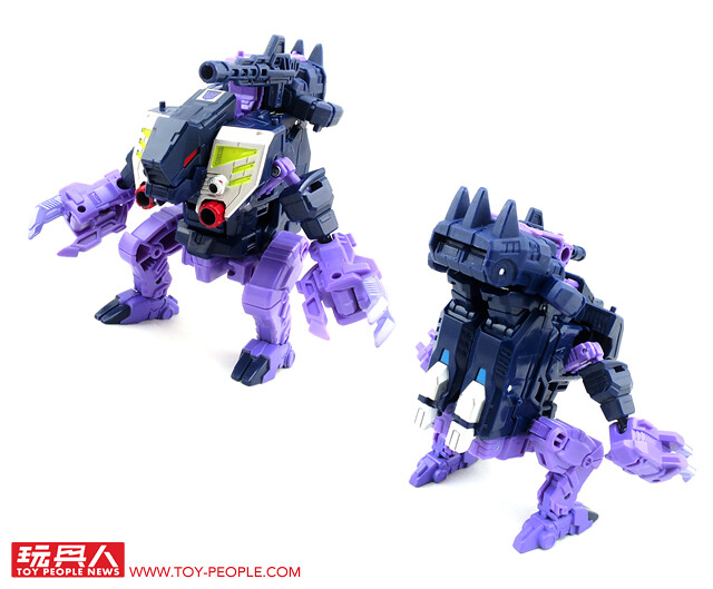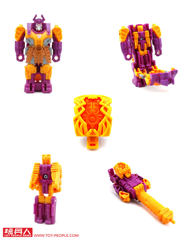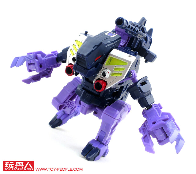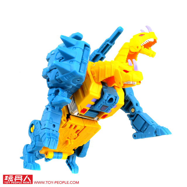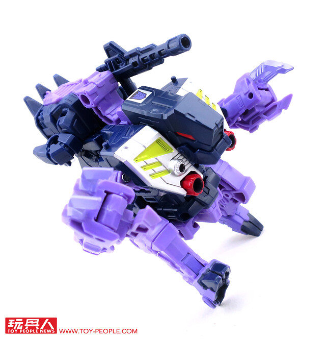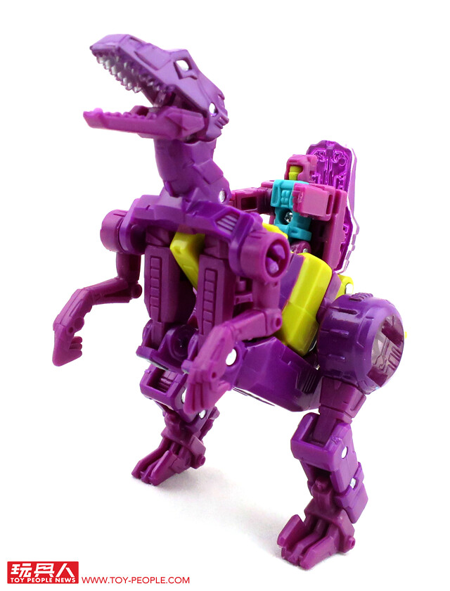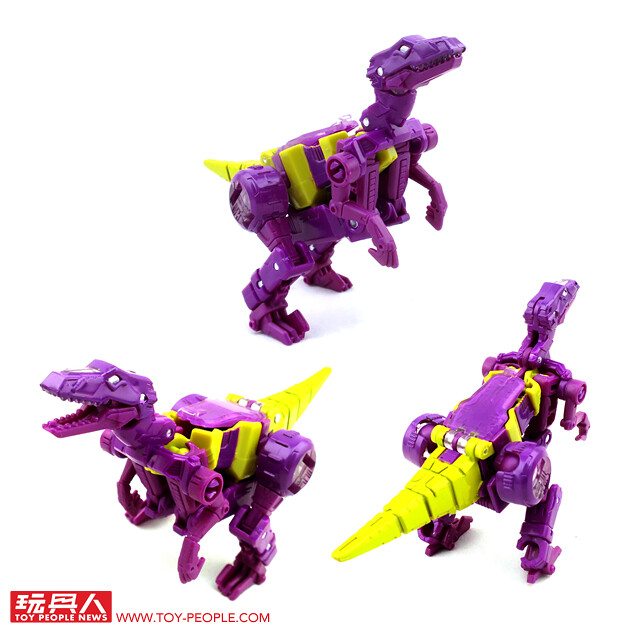 ▼「煤渣」(Cindersaur),變形為迅猛龍的狂派火燄戰士(Firecon)成員,源自於第一波的砍殺(Slash)改模,因應了G1的原始設定而還原其妖異的黃、紫配色。