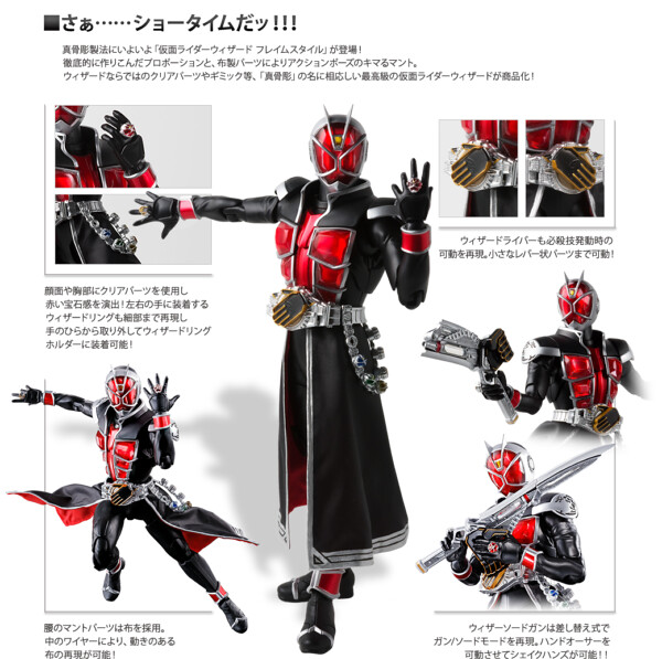 追求更高可動弧度關節以及外觀造型更加細緻的『真骨彫製法』系列,近日繼續公開將推出「假面騎士Wizard 火焰型態(仮面ライダーウィザード フレイムスタイル)」,官網日前先行公開其宣傳情報照片以及販售相關資訊。就先行公開的宣傳照片看來頭罩以及胸口部份是運用透明材質來呈現細緻的層次,服裝下擺也使用布料材質來呈現,對《假面騎士Wizard》有興趣的玩具人請持續留意玩具人網站後續報導。