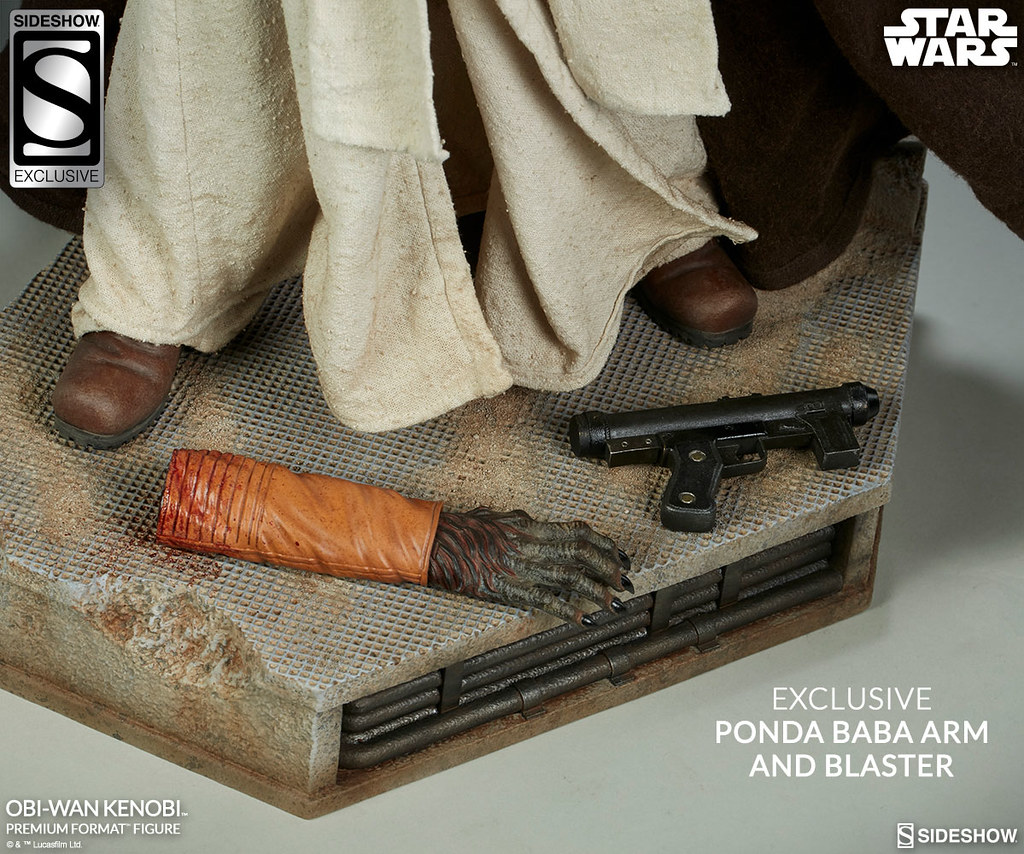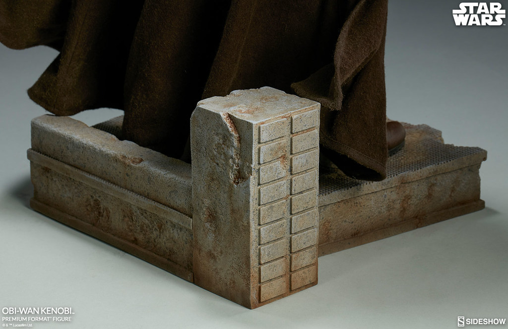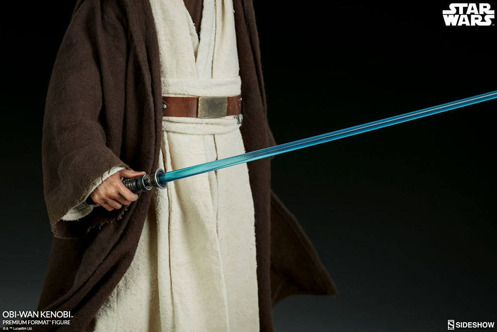 「歐比王·肯諾比 1/4 比例全身雕像」高約50 公分,以高超的製作技術重現劇中樣貌,頭雕的呈現非常精彩,逼真地還原「亞歷·堅尼斯爵士」的神態,並打造出精緻的皮膚紋理和髮型、鬍鬚等細節,布料質地的服裝更添本作真實感,褐色的斗篷還內置鐵絲,能夠使歐比王的姿態更加動感張力,右手包含準備拿取光劍柄和持握光劍的狀態可以切換,而在EX 版中,還追加了在摩斯艾斯利酒吧中,被歐比王用光劍砍斷的Ponda Baba 手臂跟他的手槍喔!斷臂的斑斑血跡實在好逼真啊~