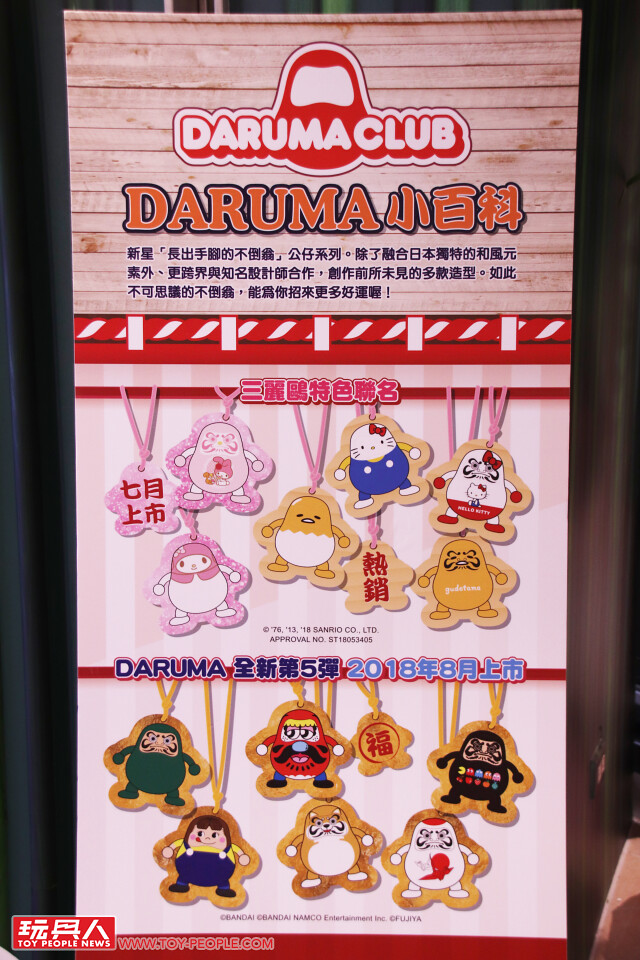 「DARUMA CLUB」是以長出手腳的幸運物「不倒翁」為主題的系列,除了結合日本傳統元素,製作了許多東洋風濃厚的作品外,還有推出與《哥吉拉》、《超人力霸王》、《無敵鐵金剛》、《ONE PIECE》.....等聯名的有趣之作!而這次夏季限定的「期間限定DARUMA CLUB祭典特色展示區」除了有展示多款與三麗鷗角色聯名的可愛不倒翁外,超巨大的400% 不倒翁實在太搶眼啦~還有還有,將於2018年8月發售的「DARUMA CLUB Vol.5」也以紙板形式現身囉!