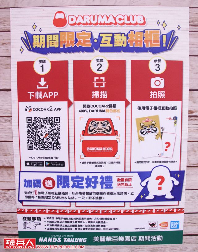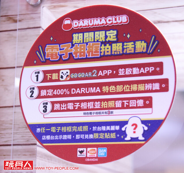 除了可愛的不倒翁可以欣賞之外,只要下載「COCOAR2」的APP、並掃描現場的400% 巨大不倒翁,手機就會出現三種可愛的不倒翁主題電子互動相框,不管是拿來拍現場的不倒翁玩具、還是跟朋友一起自拍都超適合,拍完照之後,到台隆的櫃檯出示相片畫面,即可換取一款不倒翁貼紙,數量有限換完為止!!