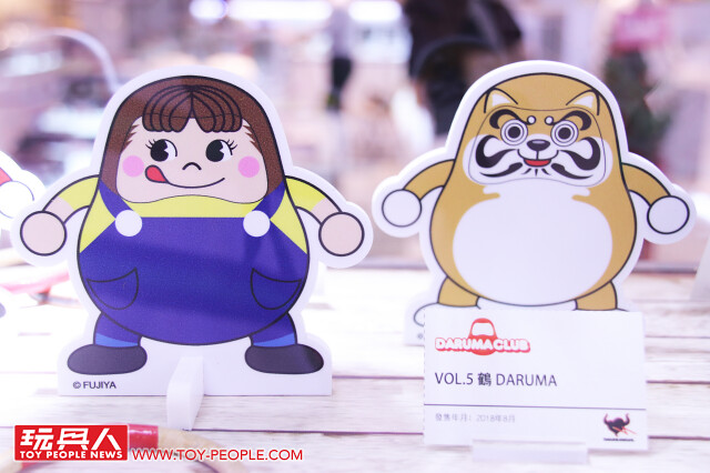 ▼以紙板形式登場的「DARUMA CLUB Vol.5」,融合了傳統的綠色不倒翁與紙鶴元素、人氣寵物柴犬、不二家牛奶妹,令人十分期待這一波!