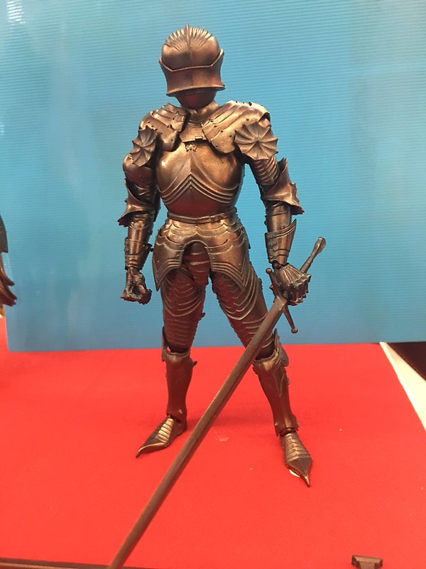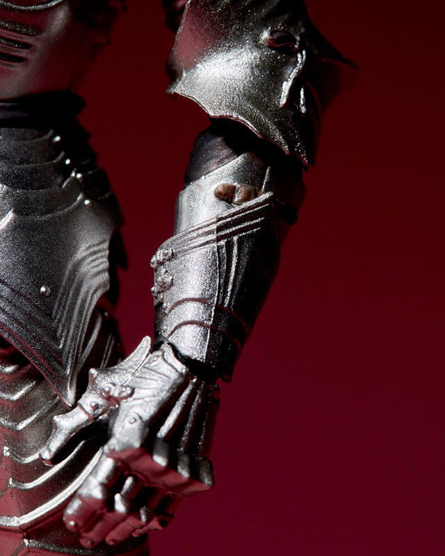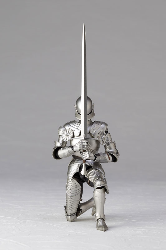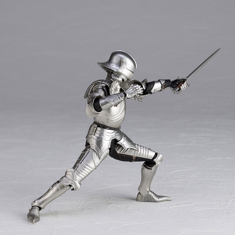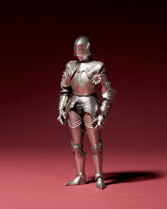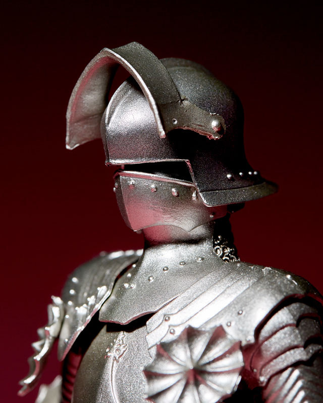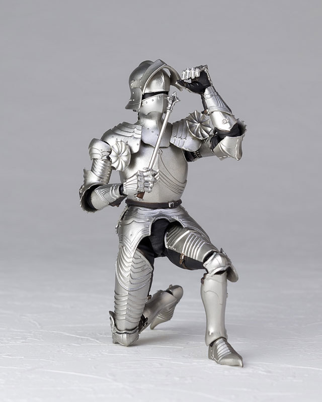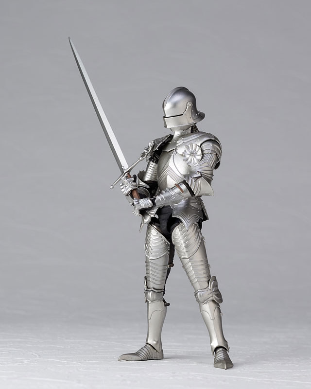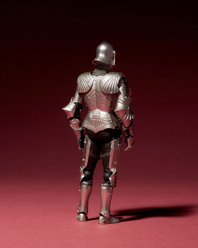 這款作品由竹谷隆之擔任造型總指揮,將 15 世紀歐洲最具代表性的盔甲「哥德式板甲」重新詮釋、設計,並結合海洋堂猛到不行的「轉輪科技」,打造成全高約 147mm 、具備 15 處關節的可動模型。部份妨礙可動的部位例如肩甲、板金褶裙等則以軟材質打造,降低可動上的干涉。