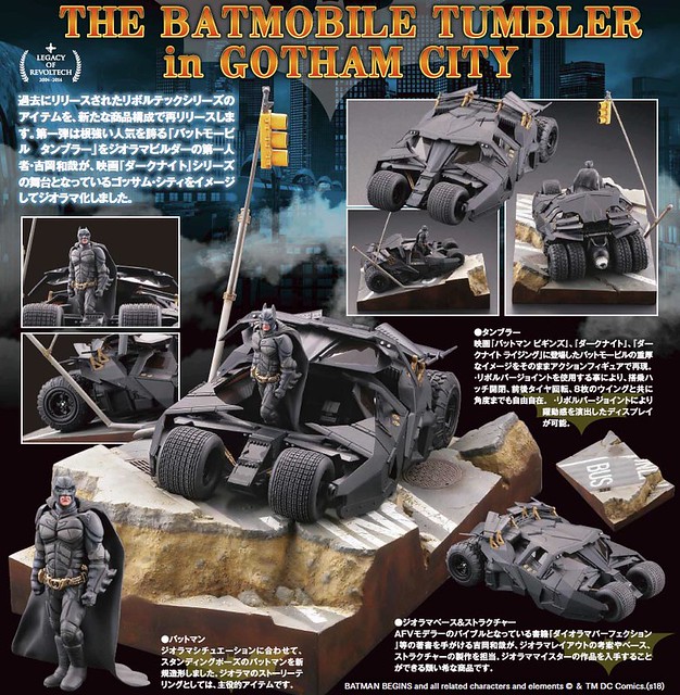 海洋堂將REVOLTECH 經典傑作集結、再推出的精選系列“LEGACY OF REVOLTECH”(レガシー・オブ・リボルテック) ,這次將繼續推出「在高譚市的蝙蝠車(バットモービル タンブラー in GOTHAM CITY)」(名稱暫譯),這次是以"克里斯多福·諾蘭"導演所拍攝的《蝙蝠俠》電影三部曲,當中所出現特殊造型的"蝙蝠車"以及劇中的場景來設計。