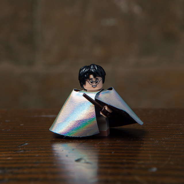 這裡的哈利是採用短腿的樣式,目前還不確定究竟服裝是什麼花樣,推測應該是睡衣造型,可以罩住全身的隱形斗篷是個很有趣的配件~用上帶有反光材質的纖維製作,營造出隱形斗篷還沒發揮出效果、看起來閃閃發亮的樣子,另外,還附有魔杖。