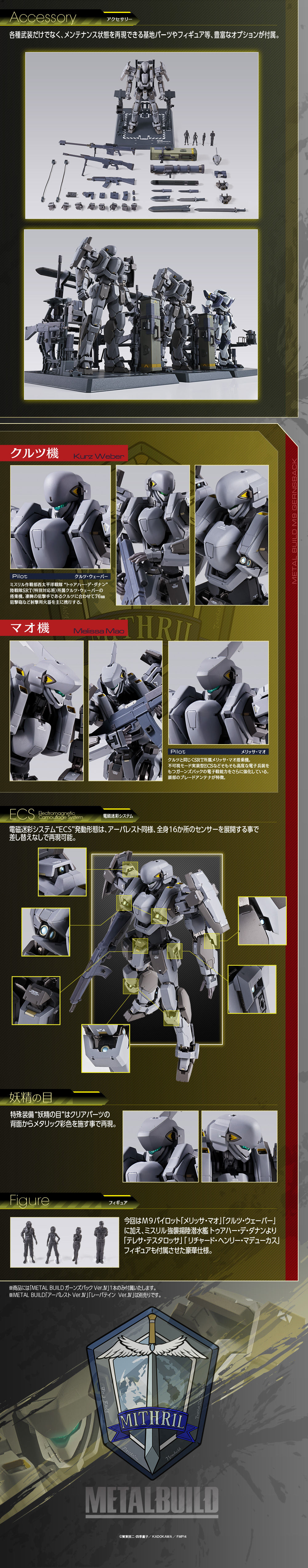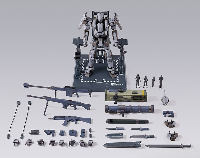 武裝收錄了「M1067 對AS用手榴彈」、「M1108 反戰車擲刀」、「XM18 䌫繩槍」、「GRAW-2 單分子切割刀」、「Bofors 57mm滑膛砲」、「76mm狙撃砲」、「GDC-B 40mm步槍」、「超高速導彈」、「多目的飛彈」、「AS用手槍」,可說是MB系列數一數二的多,武器也能夠收納於基地造型的地台上。此外配件中還附上了克魯茲、毛、泰莎、理查馬德加斯中校等人的人偶。
