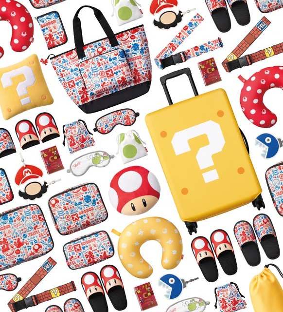 「超級瑪利歐 旅遊週邊商品」將《超級瑪利歐》的世界觀融入各類實用旅遊用品,從行李箱、綁帶、眼罩、頸枕到拖鞋,各種讓你的旅途更加便利、舒適的用品都使用了你熟悉的人物、圖案設計,像是可愛的超級蘑菇&問號磚塊兩用頸枕、耀西眼罩,以及拖出去超醒目的問號磚塊行李箱,全都充滿了《超級瑪利歐》系列的魅力呀!