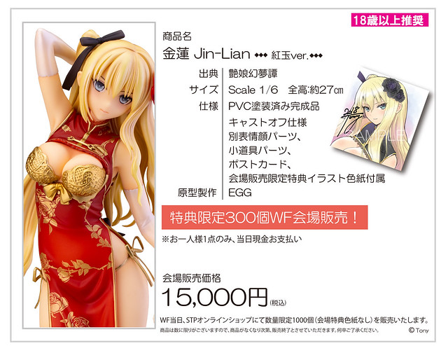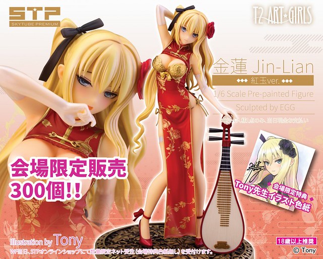 作品附有兩款不同表情的頭雕可以替換,還有樂器等等的道具附錄其中,另外衣裝也設計成可以拆卸式的設計,讓紳士玩具人可以欣賞不同面貌的金蓮作品,此作即將在7月29日於日本幕張展覽館所舉行的「Wonder Festival 2018(Summer)」,在STP攤位於展覽當天300個先行限定販售,多附有限定特典是Tony老師所繪製的"金蓮平面印刷品",喜愛《艶娘幻夢譚》系列的玩具人可以參考一下歐!