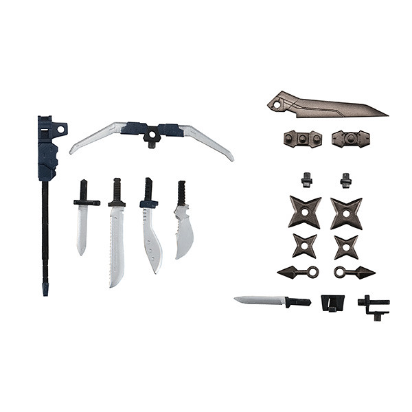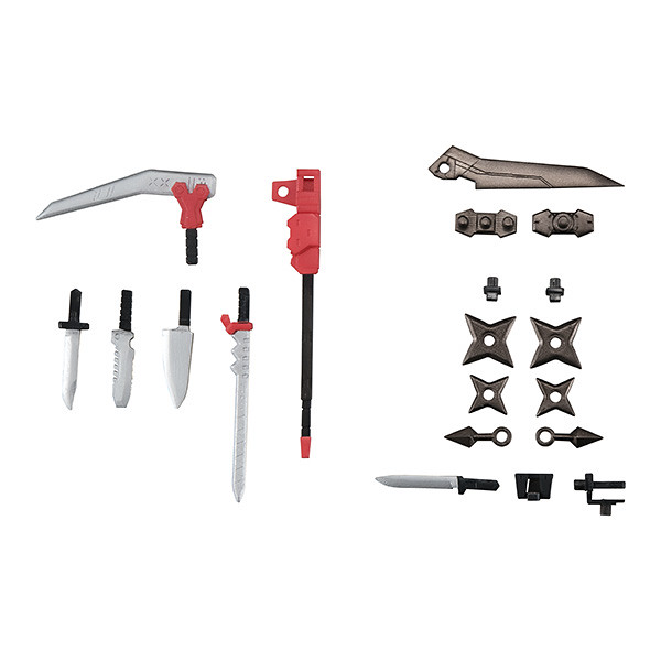 「KT-323f 迅雷系列」共推出了 4 種內容,赤影與藍影除了有髮型、表情零件的差異外,所使用的近戰刀械、長柄武器也有所不同,武裝配件中還附上大量的手裏劍、苦無等武器,可自由替換.組合出多種可能性!另外集齊分別收錄在各盒的武裝零件四種後,就能組合出柳瀬敬之新設計的大型手裏劍「Quad edge unit」!