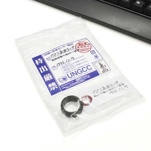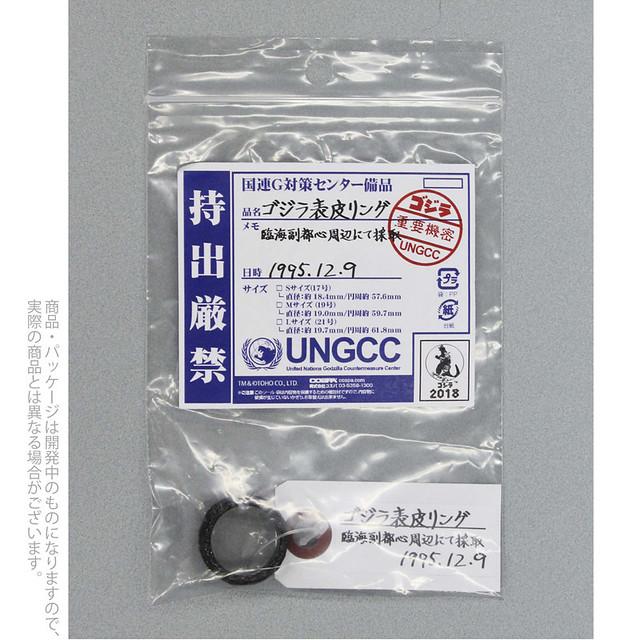 這款「哥吉拉表皮戒指」就被設定為 1995 年 12 月 09 日時,國連 G 對策中心前往哥吉拉的溶解現場採集樣本,意外在哥吉拉的部份表皮發現了外觀和表皮相同,但卻是戒指形狀的物體。經過國連 G 對策中心檢驗,這個戒指形狀的物體並沒有輻射反應,並且會發出黑色電鍍般的光澤,所以...你們就拿來賣錢了!?