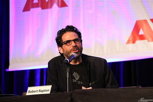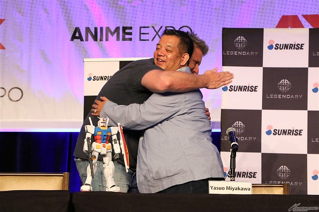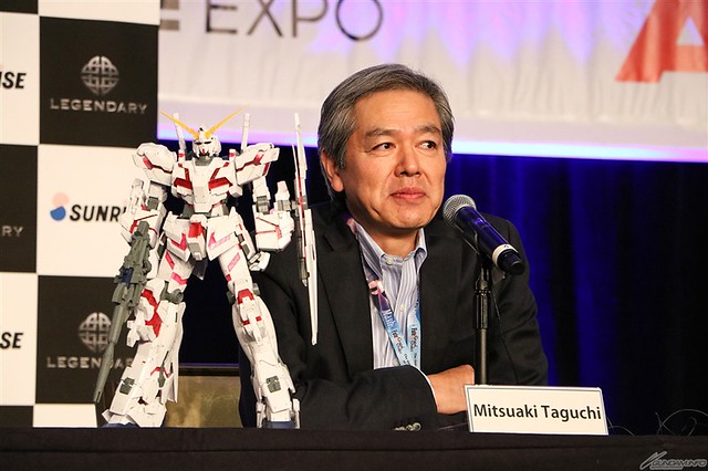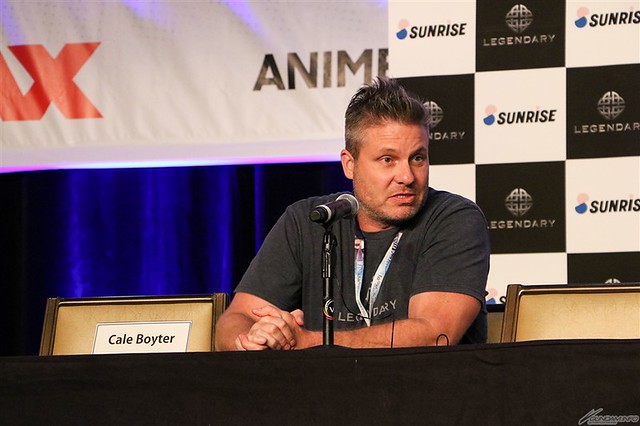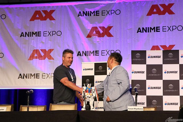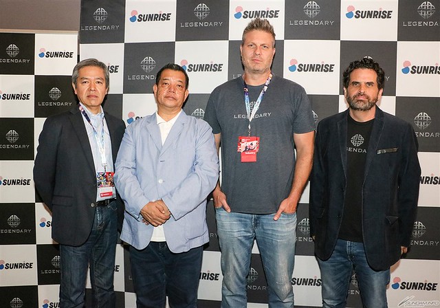 ▼ 今日在「Anime Expo 2018」中,傳奇影業製作人 Cale Boyter、傳奇漫畫 Robert Napton、萬代南夢宮控股社長 田口三昭、日昇動畫社長 宮河恭夫共同舉行發表會。
