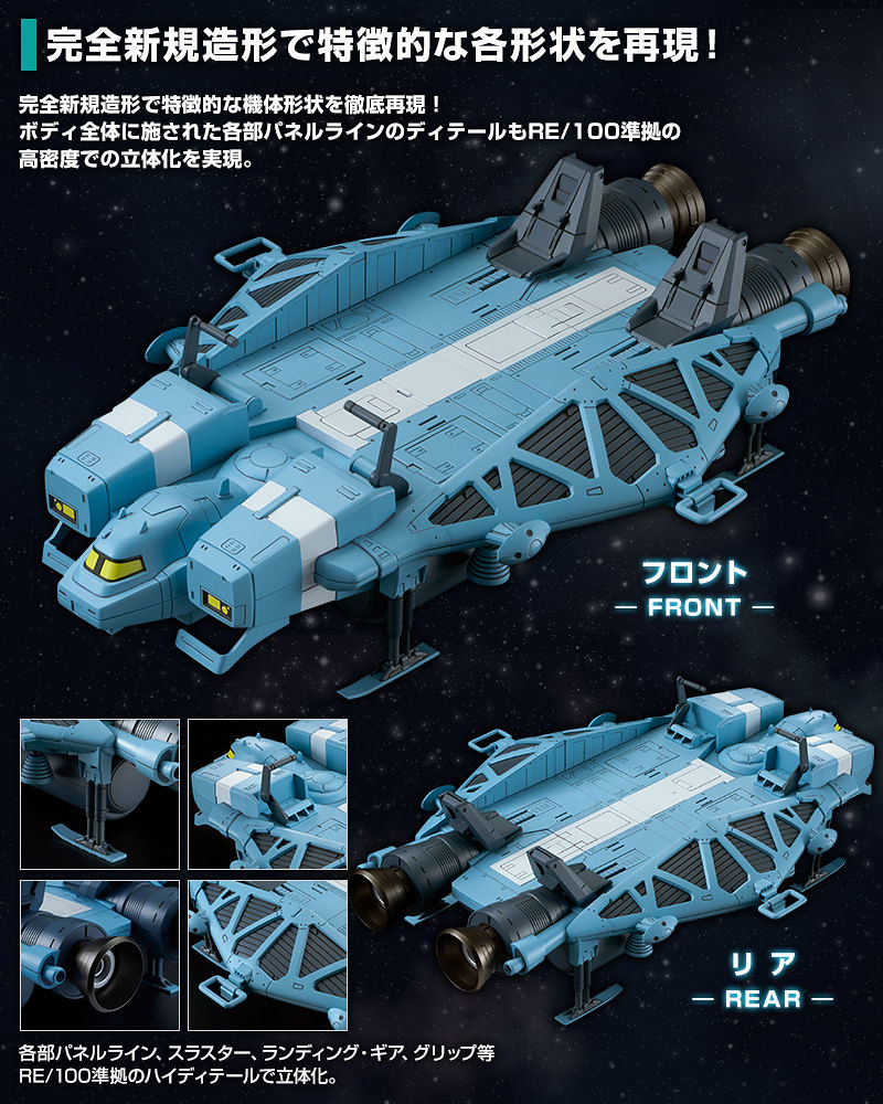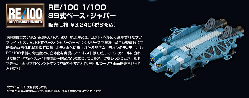 以完全新規零件製作的「RE/100 89式噴射座」擁有 MG 等級的高度細節,機身裝甲、推進器皆有非常精密的刻線,並且重現了起落架、腳架、握把等機構,配合對應 MG 版傑鋼、傑斯塔、傑斯塔加農的專用固定零件,就能再現它們趴在89式噴射座上的場景,下半部的燃料槽移除後更能再搭載一架 MS!