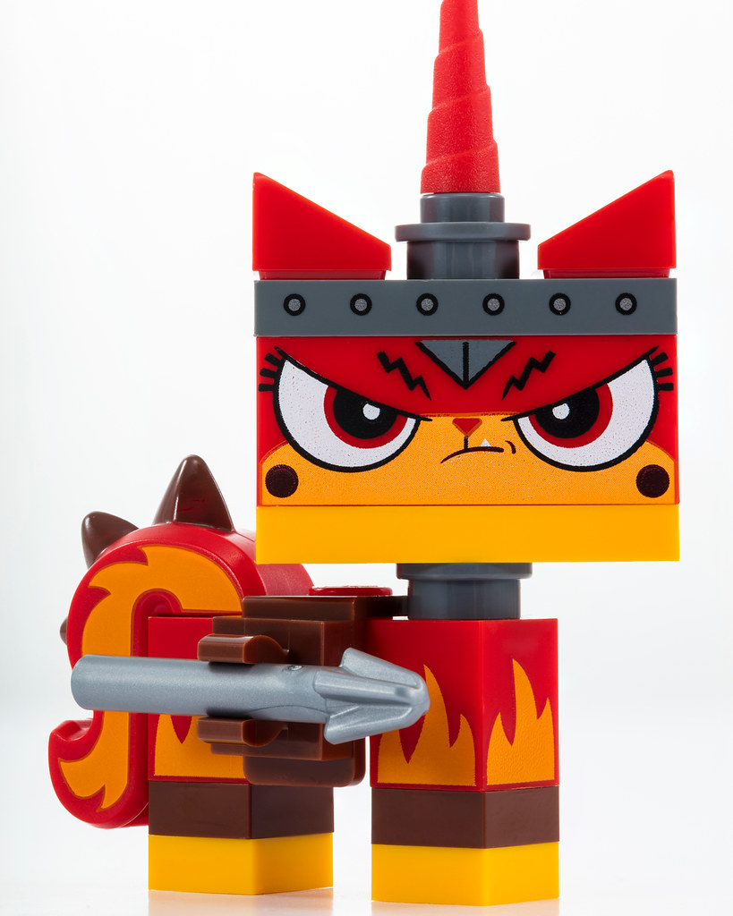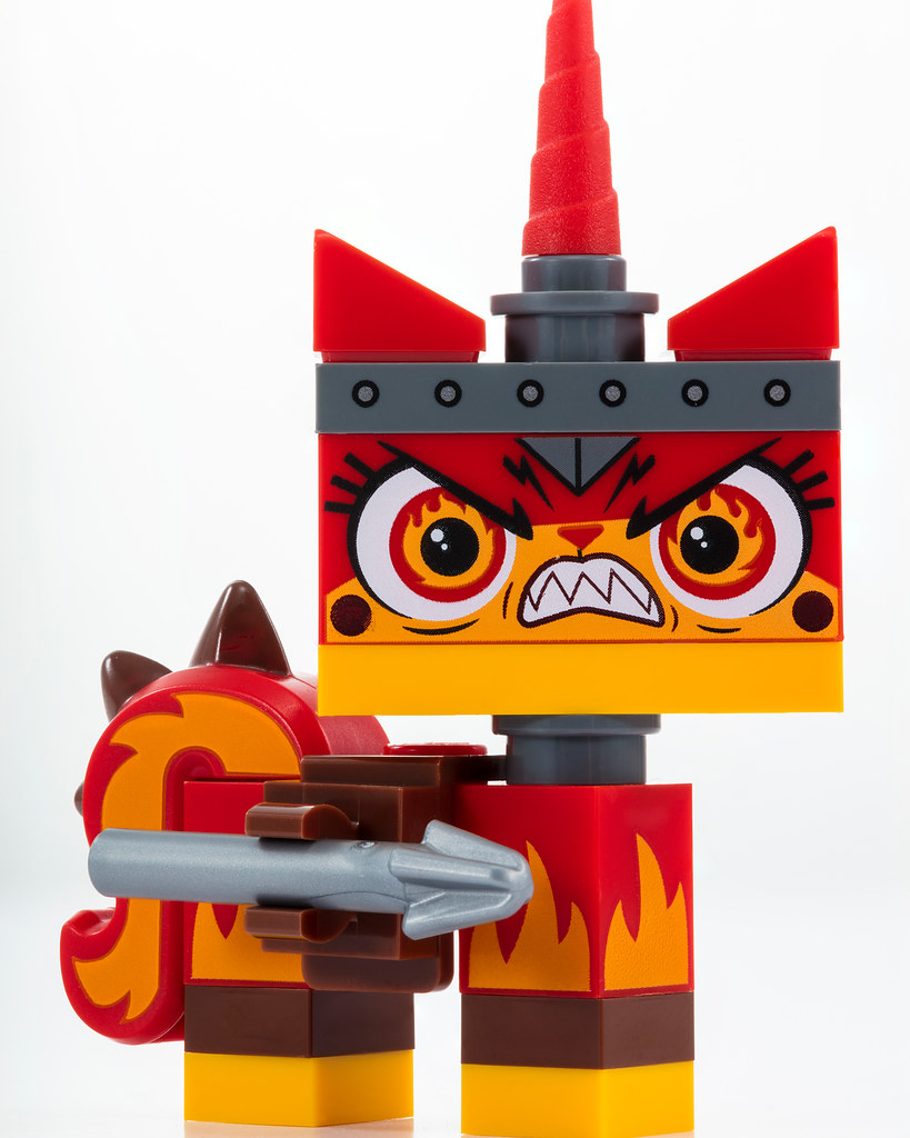 這次的獨角貓有兩種表情,一種是生氣,另外一個是氣到不行!!身體跟尾巴有著熊熊燃燒的火焰圖案,而且尾巴上還有刺!整個超兇暴的~灰色頭盔則是獨立的印刷件,另外還附了弓箭,完全是對應末日情節的裝扮,讓人越來越期待《樂高玩電影2》啦~!