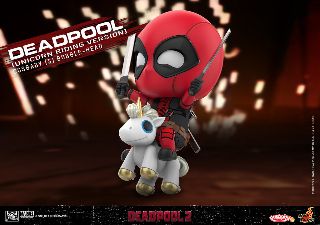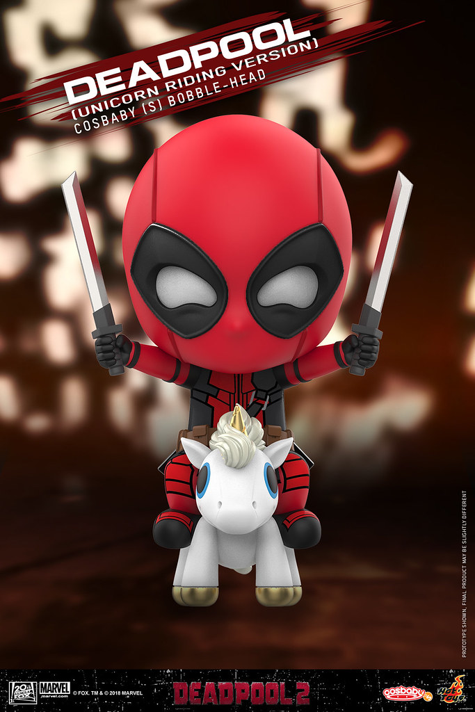 在這波根據電影設定所製作的「死侍 Cosbaby(S) Bobble-Head Series」中,包含讓子彈偏移、X 戰警實習生服裝、優雅姿勢、握著手榴彈、騎著獨角獸,以及在劇中沾染沙塵、致敬漫畫裡的X-Force 造型,共計6 種版本,每款作品都以該系列特有的Q 版身型比例重新詮釋,高約6.5~10 公分不等,非常歡樂又有滿滿的惡趣味!