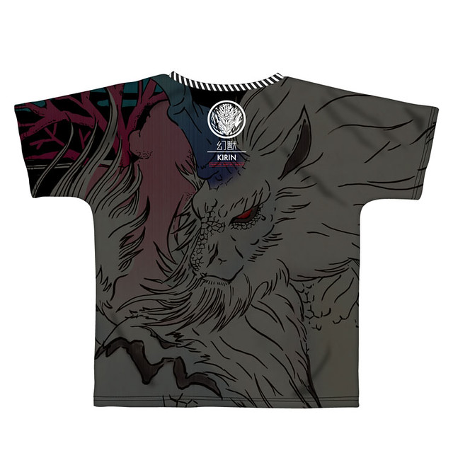 以滿版印刷將整件 T-shirt 印上浮世繪風格的麒麟圖樣,忠實再現了浮世繪獨特的用色與筆觸,背景更是麒麟出沒的「陸珊瑚台地」!