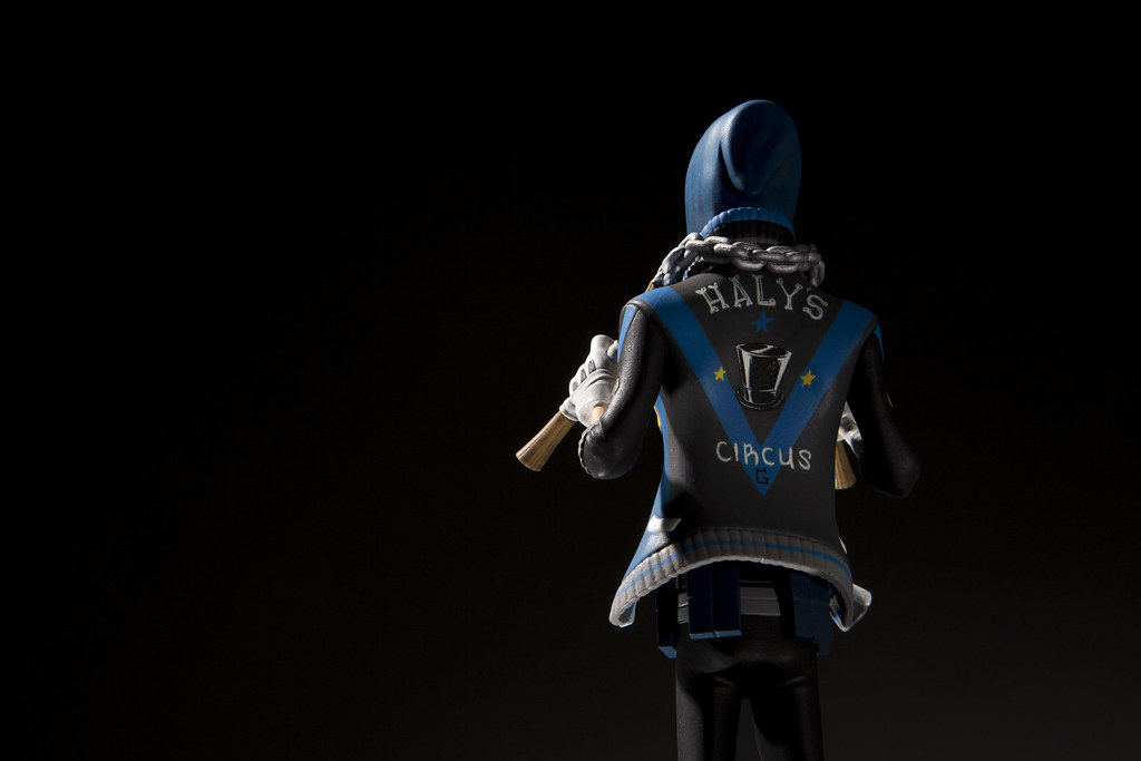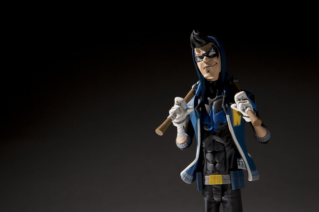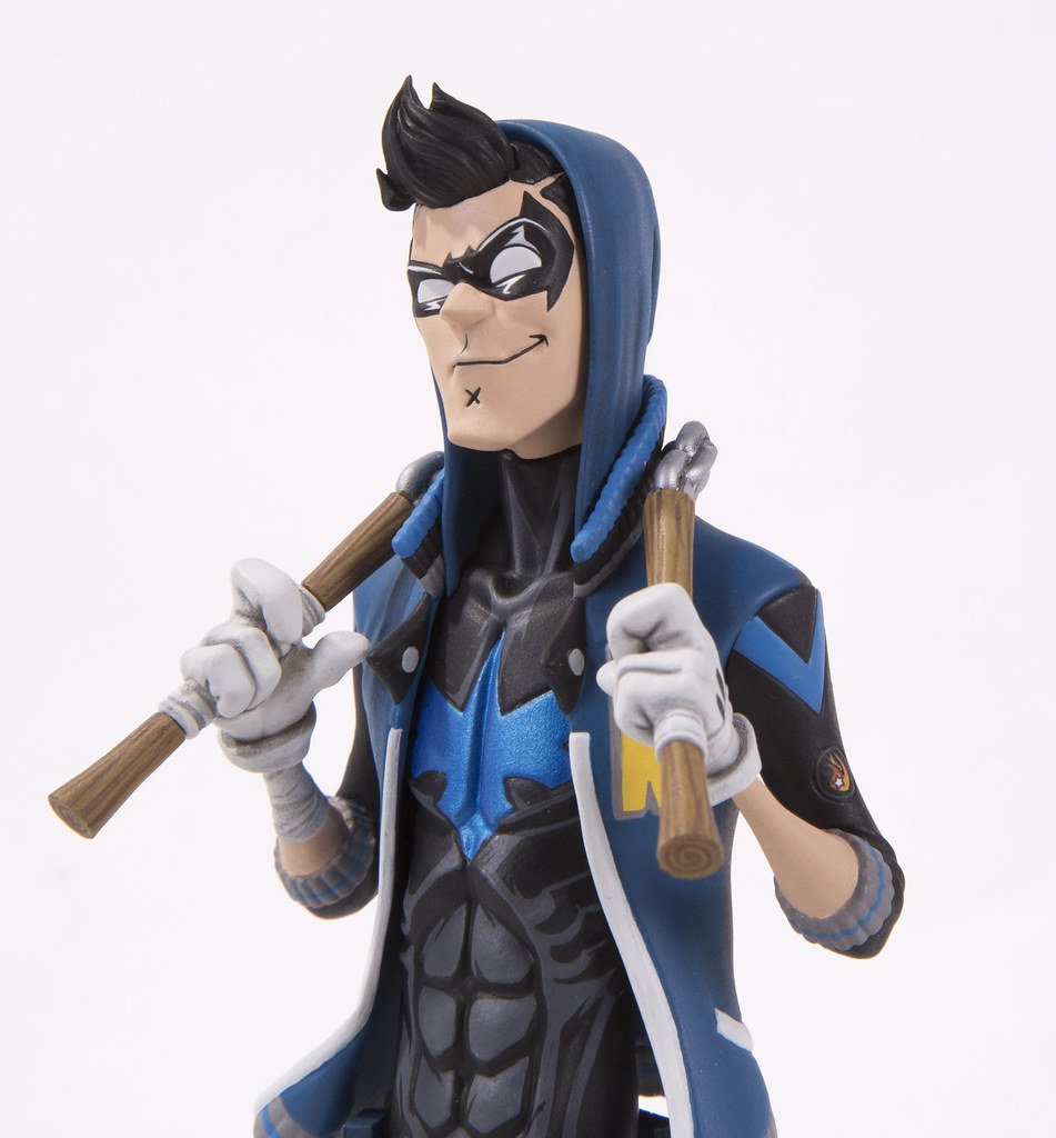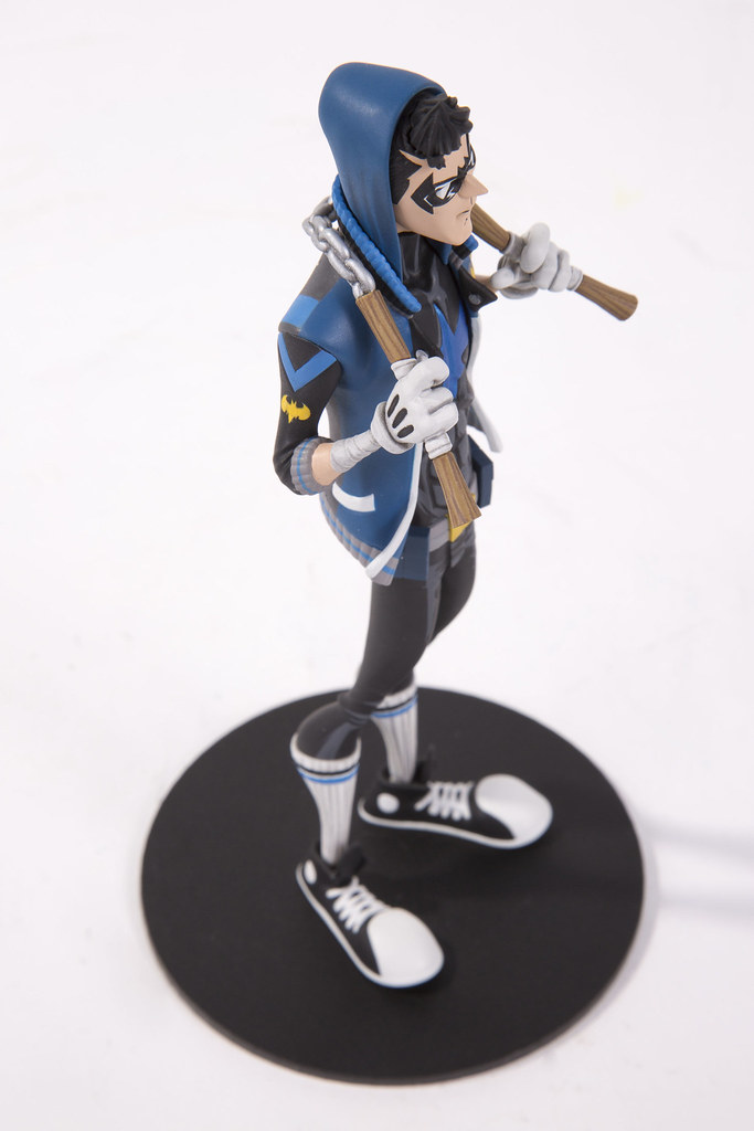 「夜翼 by Hainanu "Nooligan" Saulque」高約18 公分,結合了夜翼本身經典的緊身戰衣與街頭風格的穿搭,胸前的藍色標誌帶有金屬色塗裝,更運用精彩的上色營造出腹肌的立體感,誇張的身形線條也被造型師Paul Harding 完整地形塑,除了和蝙蝠俠一樣穿著長筒襪、帆布鞋之外,還套上了具備飄揚動感的藍色連帽外套,加上掛著自信笑容的臉孔真帥氣!招牌武器搭檔棍則變成以鎖鏈連接的木頭雙節棍。
