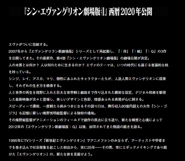 ▼《福音戰士》官網也更新的介紹頁面,正式公開《新·福音戰士劇場版:│▌》為新劇場版的完結篇。