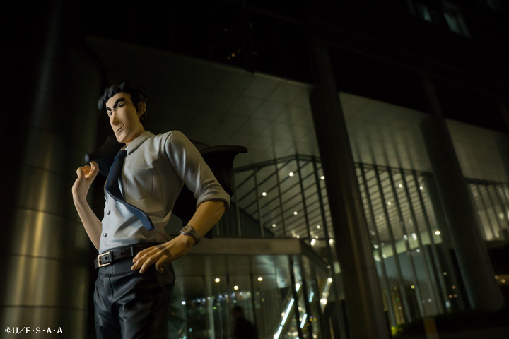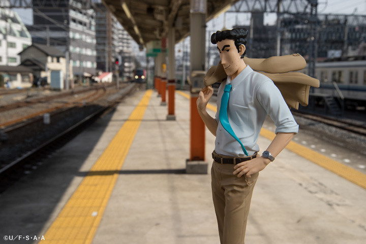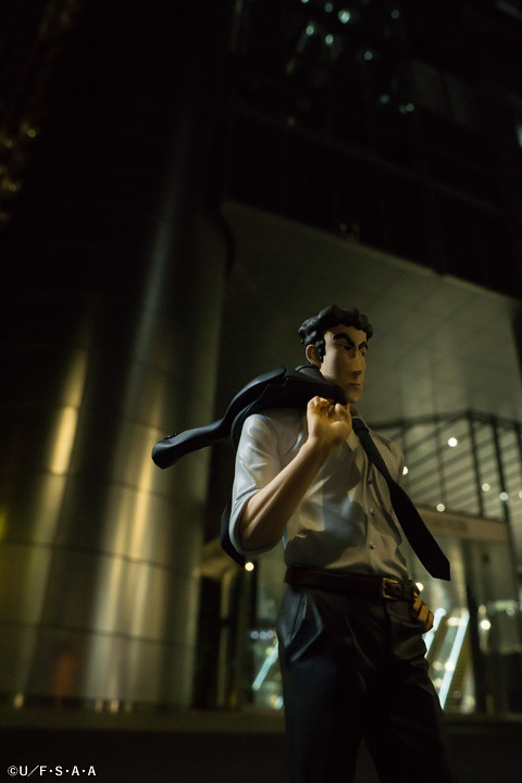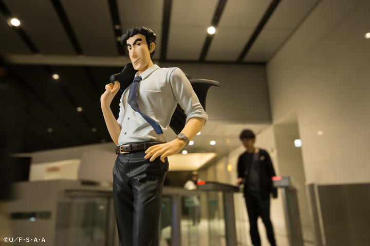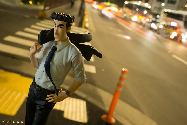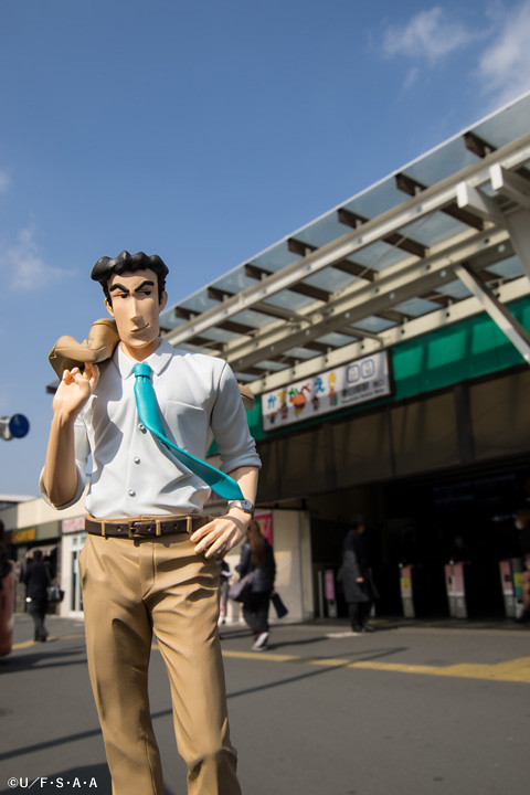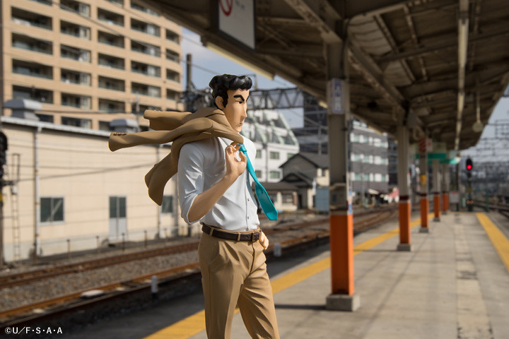 攝影師 Shara 更使用了公司大門、車站、月台等場景,塑造出野原廣志身為可靠課長的形象,運用了自然光源呈現了作品的服裝皺摺、肌肉線條等細節。即使是上下班通勤,廣志依舊保持一個風度翩翩的姿態,彷彿事業有成家庭美滿,毫無 32 年房貸的壓力。