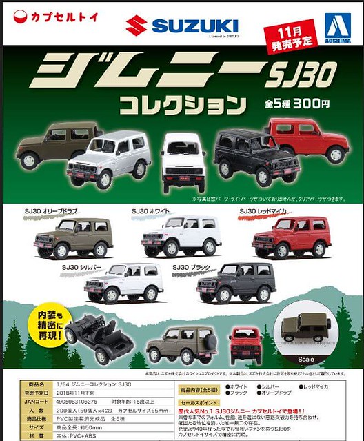 由日廠青島文化教材社(AOSHIMA)之前以各式車款縮小來推出轉蛋商品,像是「1/32 Super Cub機車」、「1/50 復古三輪車」、「三輪車集合」以及「1/64 SUBARU小貨卡」等等都頗受喜愛小車收集玩具人們的好評價,這次將繼續推出「鈴木Jimny SJ30越野車集合(ジムニーコレクション SJ30)」(名稱暫譯)以約1/64比例的縮小尺寸來呈現的轉蛋作品,喜愛小車系列的玩具人可以參考一下歐!