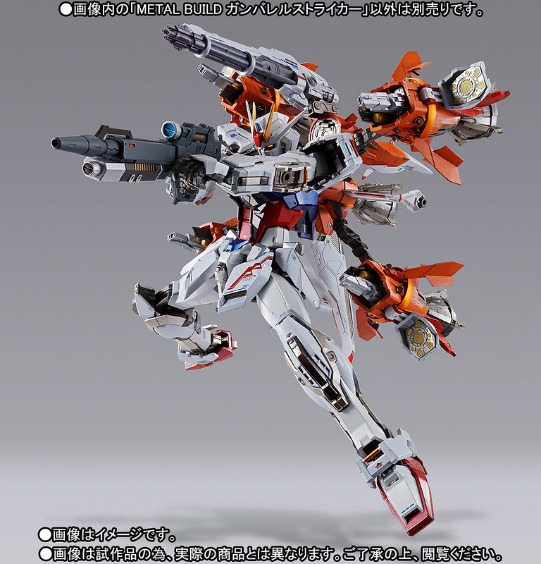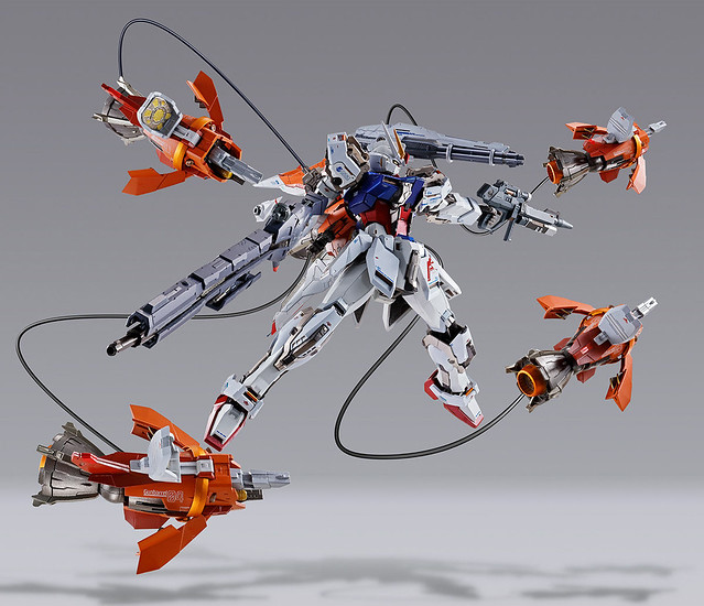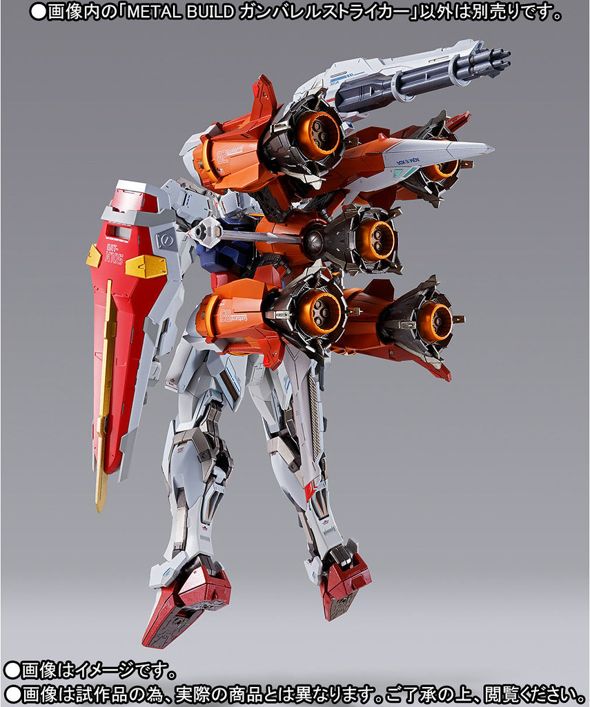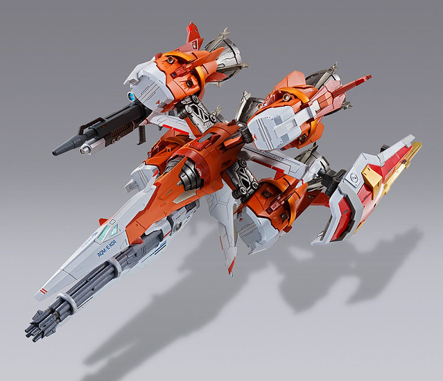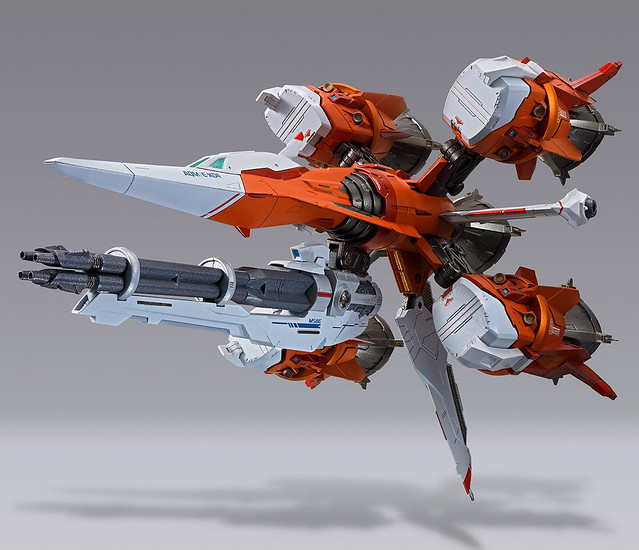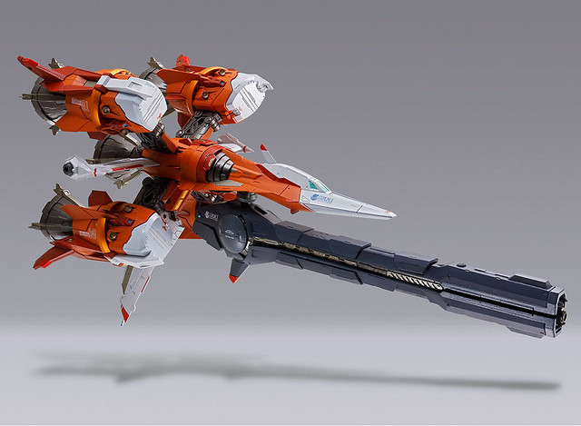 「METAL BUILD 砲筒型攻擊者」由以異端鋼彈系列聞名的阿久津潤一老師擔任設計,本體機翼、機首的造型比原設定更為修長,四門有線式砲筒也打造出展開機構與精美內構,可觀賞到內部雷達、飛彈、實彈砲塔等精密造型,另外還追加 MB 原創武裝「大型磁軌砲」,炮身具備展開機構,裝備於砲筒型攻擊者上時,整個外型都讓人聯想到它的前身「梅比烏斯零式」。