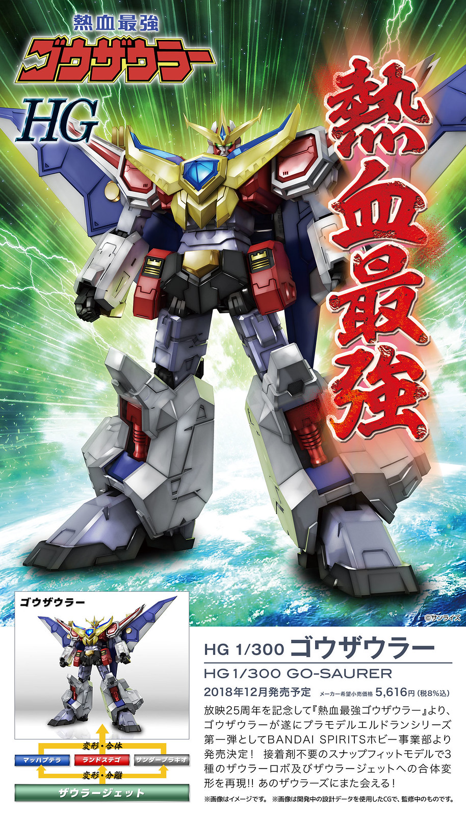 「HG GO-SAURER 1/300比例組裝模型」由當年負責《熱血最強》機械設計的「やまだたかひろ」老師進行監修,套件不僅再現原設定的霸氣的上身比例,細部也具備豐富的刻線細節,更能重現翼龍、劍龍、雷龍單體型態,並合體為機器人型態「GO-SAURER」、噴射機型態「SAURER JET」!