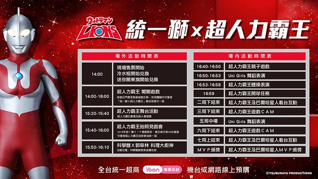 獅迷們注意啦!統一獅宣佈要與日本特攝英雄《超人力霸王》系列展開合作, 在 08 月週末的主場賽事中,將推出滿滿與超人力霸王相關的主題活動,並邀請到初代超人力霸王、達達星人、巴爾坦星人與你一起在球場上同樂!每位球員也將穿上超棒設計的聯名球衣上場應戰,讓氣氛更嗨!另外還有帥氣的聯名球衣球帽、將統一獅吉祥物「萊恩」與超人力霸王互換服裝的多款超稀有聯名主題商品等你搶購!
