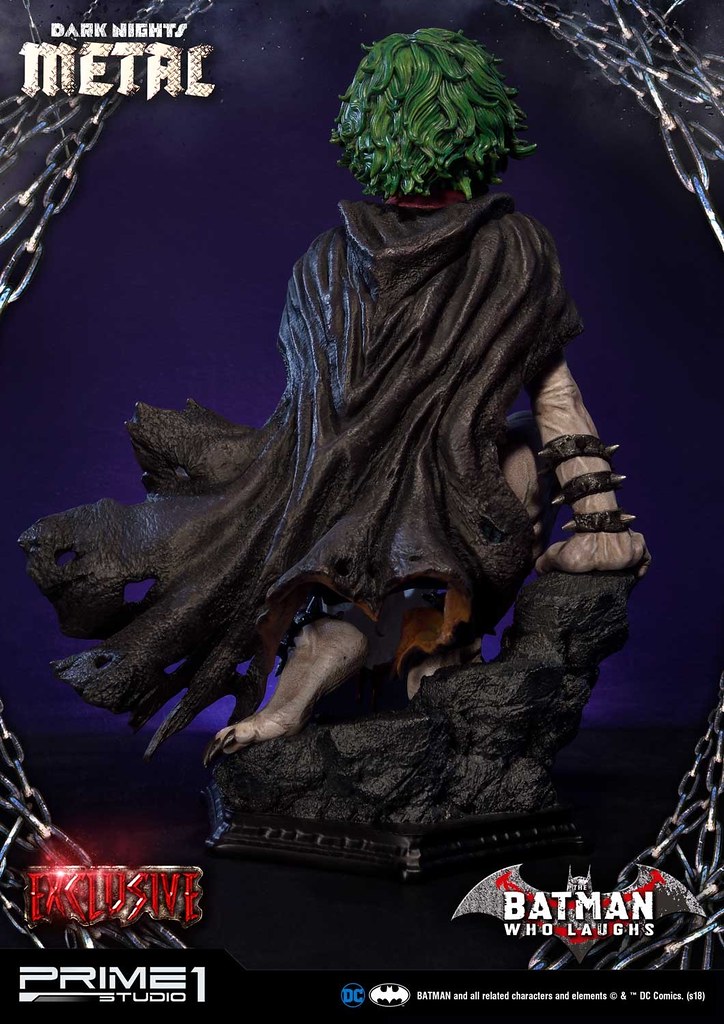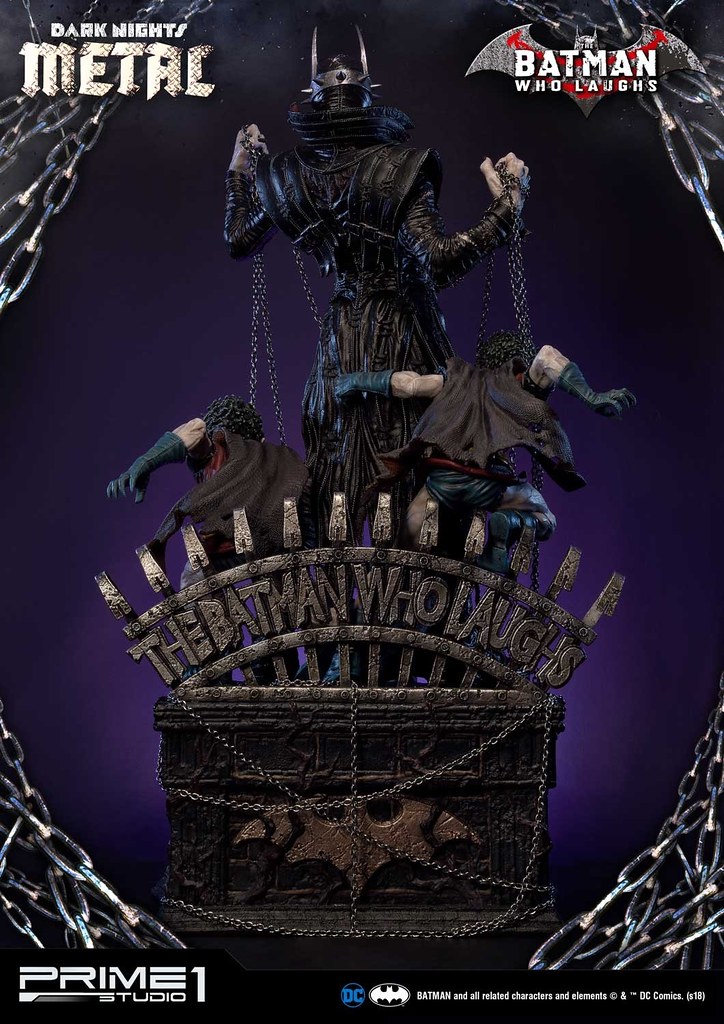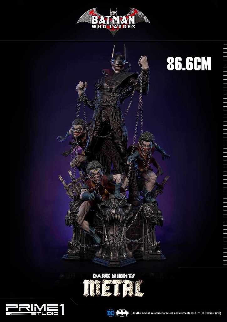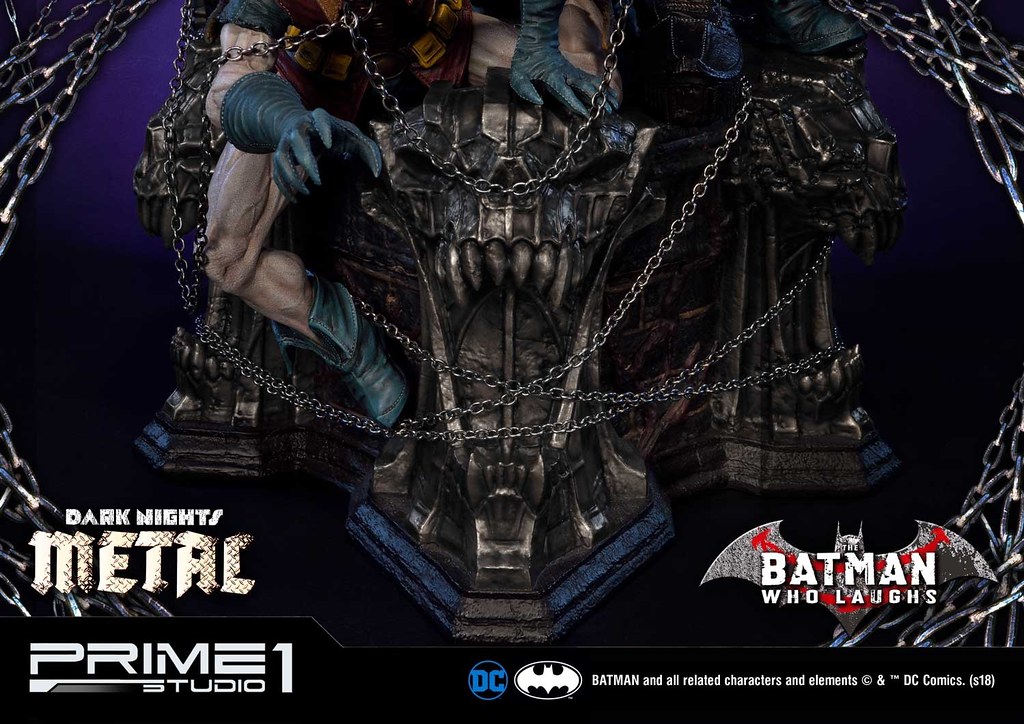 「大笑蝙蝠俠 1/3 比例全身雕像」高約86.6 公分,以超高水準的雕刻工藝再現了漫畫中的強烈風格與誇張造型,並給人極其恐怖的獵奇氛圍!大笑蝙蝠俠漆黑的服裝刻劃出大量的皺褶、層次細節,外露的皮膚形塑出大量的皺紋,嘴裡也吐出黑色的液體,被鐵鍊給鍊住的小丑化羅賓各個齜牙咧嘴,蒼白的四肢佈滿暴起的青筋和血絲,就和大笑蝙蝠俠一樣展現了脫序的瘋狂,呈現出彷彿看到獵物、準備上前將他生吞活剝的動態;而DX 版中還追加了一個可獨立展示的「達米安(Damian)」雕像!