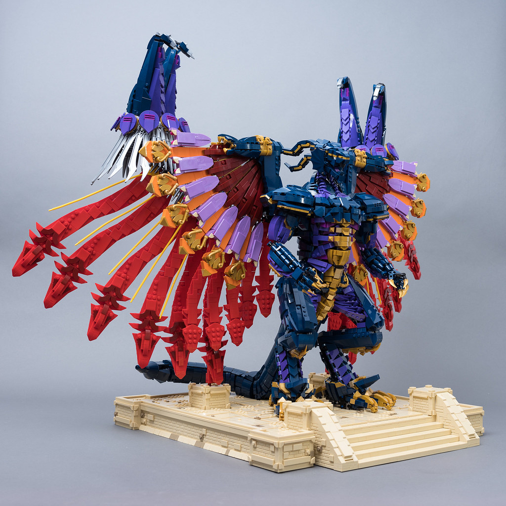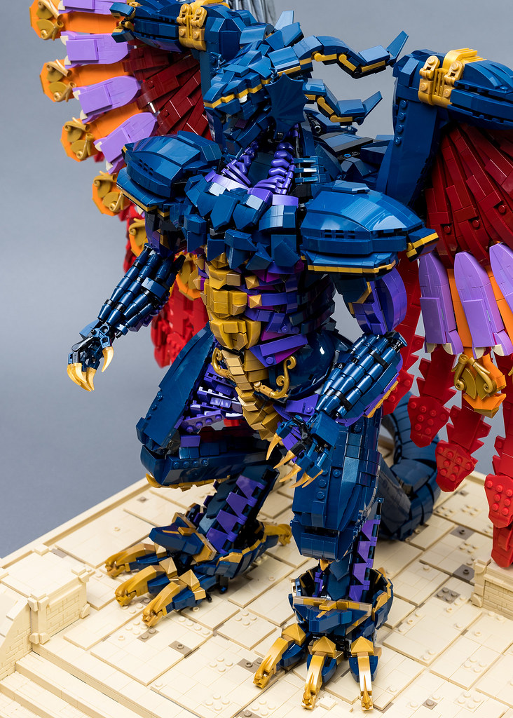 在外觀部分,為了表示出巴哈姆特身上複雜的鱗片結構,他以盾牌形狀、圓筒、弧面....等多種磚層層堆砌,金色的腹部、爪子和各處線條也一一再現,腿部也做出彎曲的造型,從胸、腹到腿部,就有深藍、桃紅、紫、金各色十分仔細,翅膀的部分也盡可能地忠於電玩造型重現,除了淡紫色和橘色的精準搭配,還用上藤蔓零件修飾絕對堪稱是神來一筆;另外,還做出了場景地台,實在太霸氣太誇張啦~~