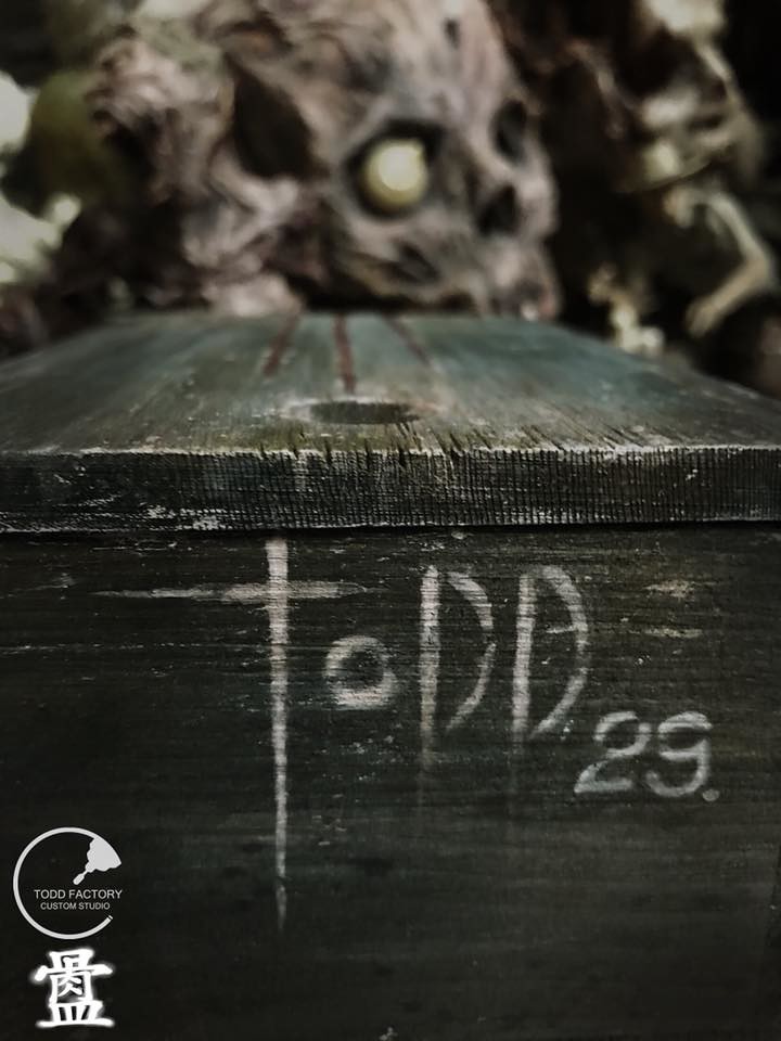 彷彿承接上方斷脖處滴下來的血一般,骷髏的頭蓋骨留下好幾道血痕,下方則是由腸子、皮膚、筋肉所組成,快要分不清是哪些部位的身體組織,絕對能給各位玩具人一場滿滿的人肉饗宴視覺震撼!另外,每一組都附屬經過寫實舊化、標上編號的木盒,以及限量編號的標籤卡,使本作的收藏價值再提升!喜愛這種獵奇風收藏的玩具人,趕快入手這款獵奇傑作吧~~:D