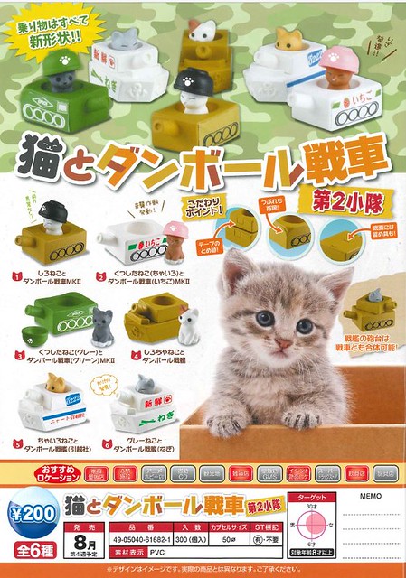 推出多款趣味貓咪題材轉蛋商品的Epoch(エポック)品牌,之前推出超多款"貓咪"題材轉蛋作品像是「脫力貓」、「打擾貓」、「太貓」、「吾輩の定位置」、「貓的美容」、「貓咪俄羅斯套娃」、「貓咪的美容」、「貓咪的美容 寒冷的下午篇」與「貓咪遊戲組」等等多款的貓咪題材的轉蛋作品,都頗受到愛貓咪的玩具人們歡迎,之前以「貓和紙板坦克(猫とダンボール戦車)」(名稱暫譯)為題材已經公開過"第一彈"後,近日再繼續公布將推出同樣題材的「第2小隊」的系列續作!