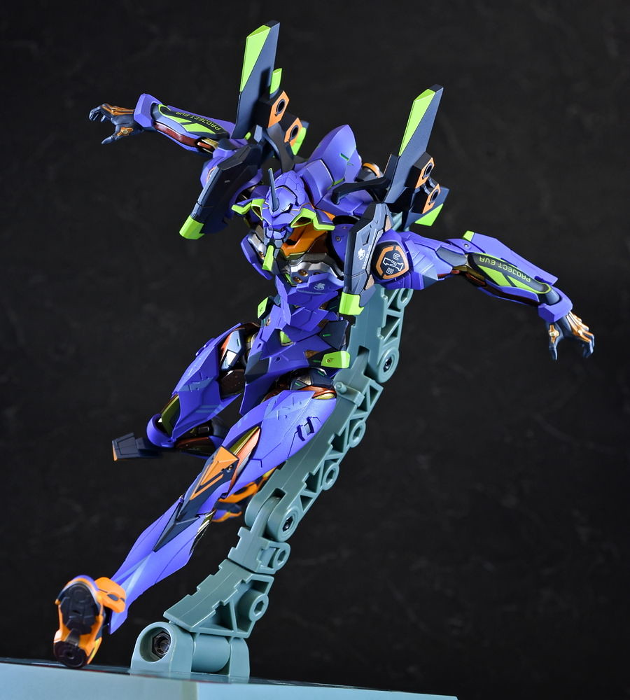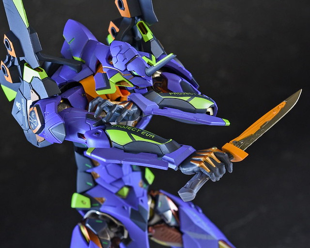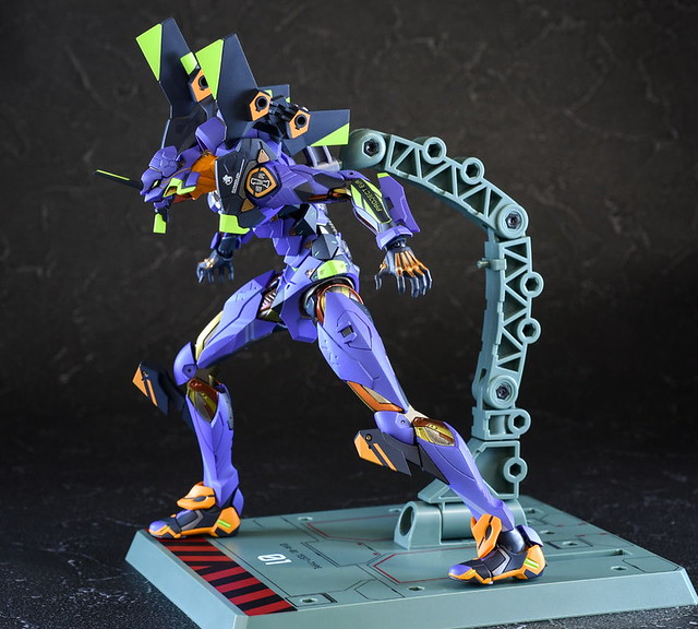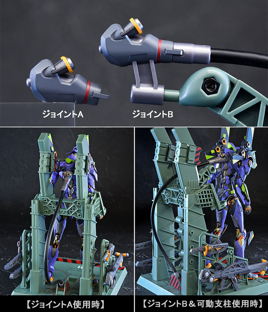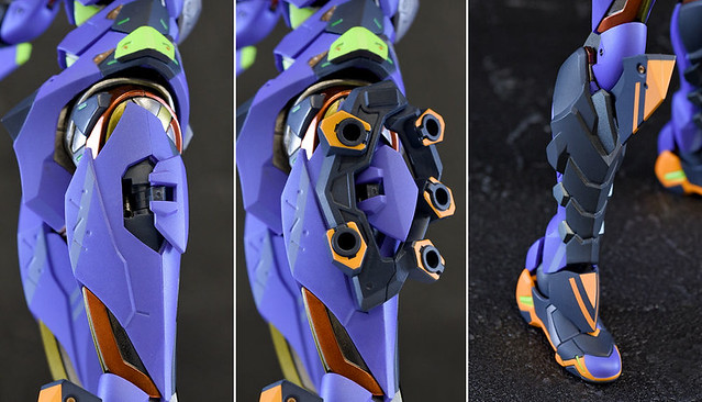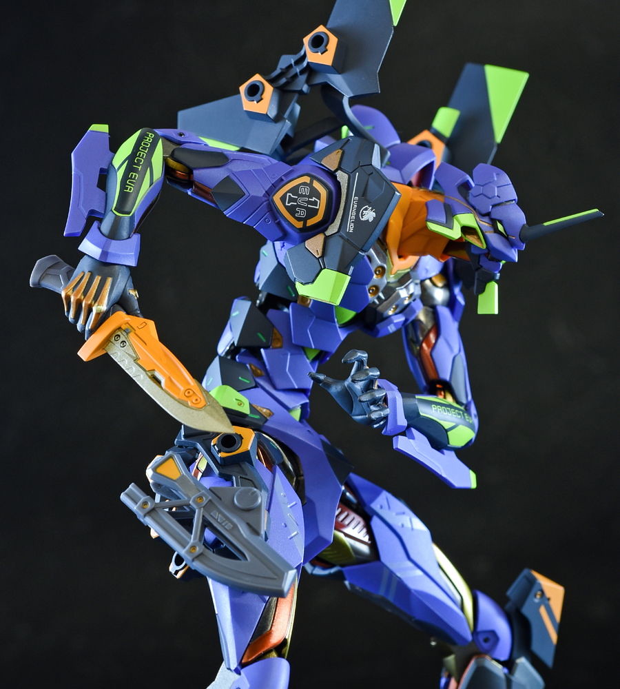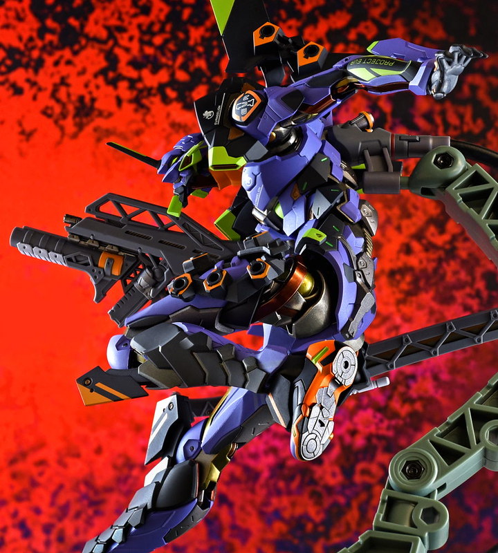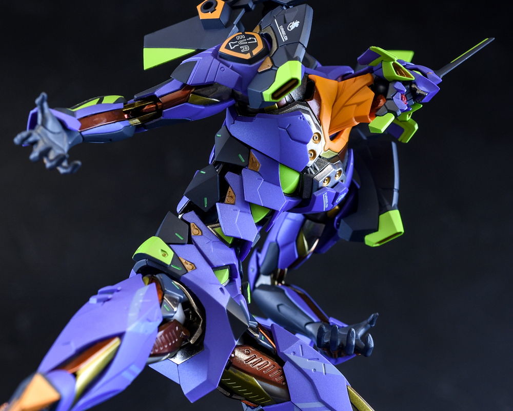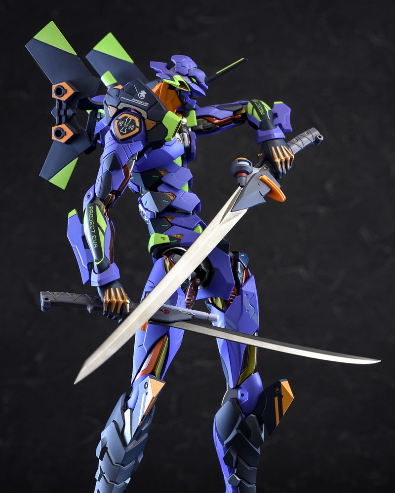 而關結構造則從高度可動的「ROBOT魂 EVA 系列」修改而來,髖關節採用全新設計、下顎也能展開。外部也追加了護目鏡、腰部武裝懸掛支架等裝備設計,讓初號機更像是「兵器」。將硬質感的裝甲、合金材質關節、複雜的設計構造集於一體,不論是拔刀、奔跑,甚至是粉絲們熟悉的暴走狀態都相當動感。