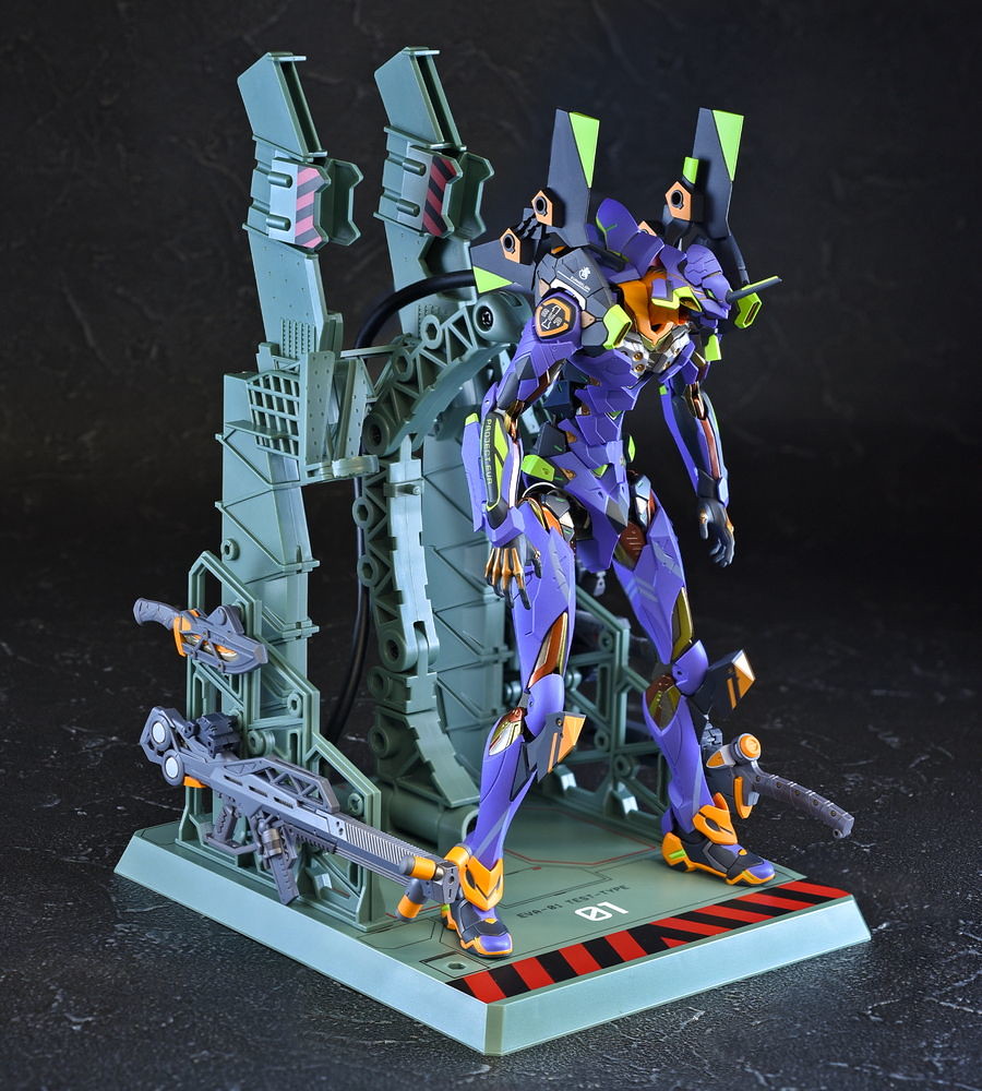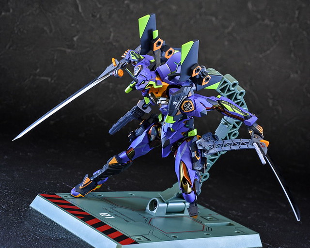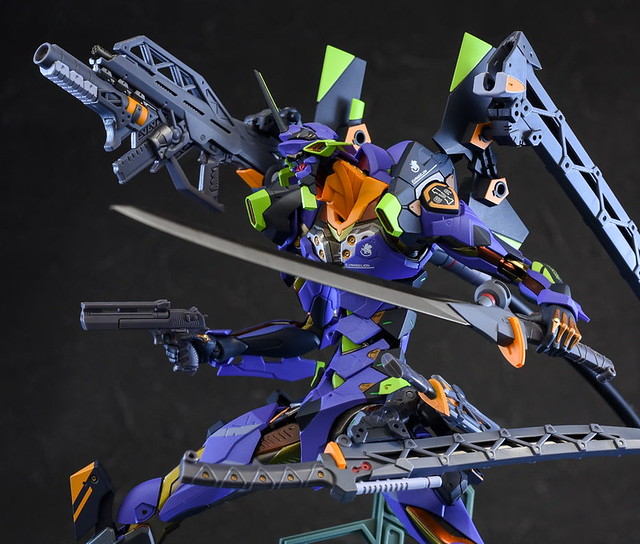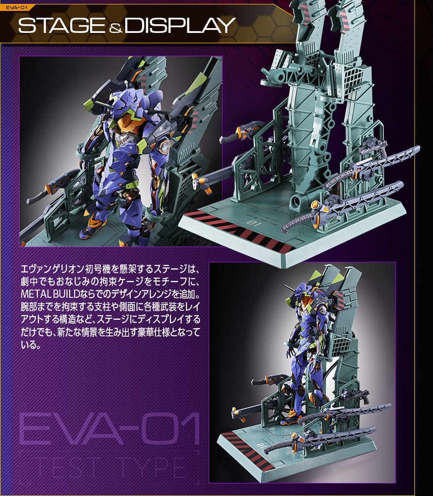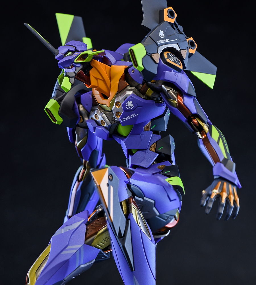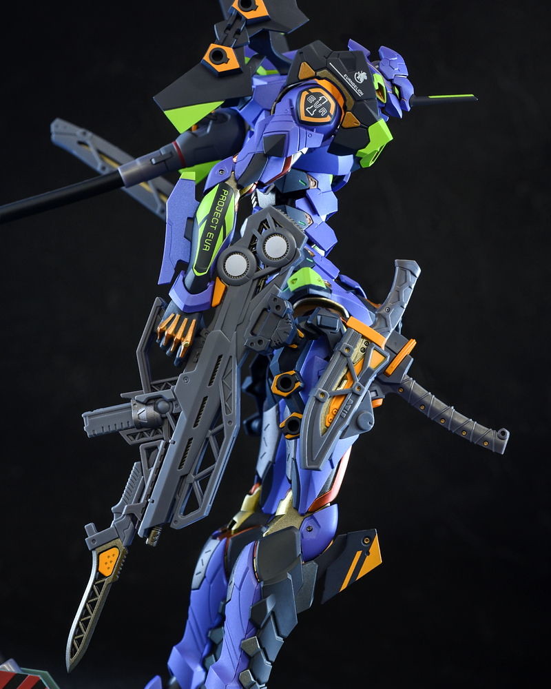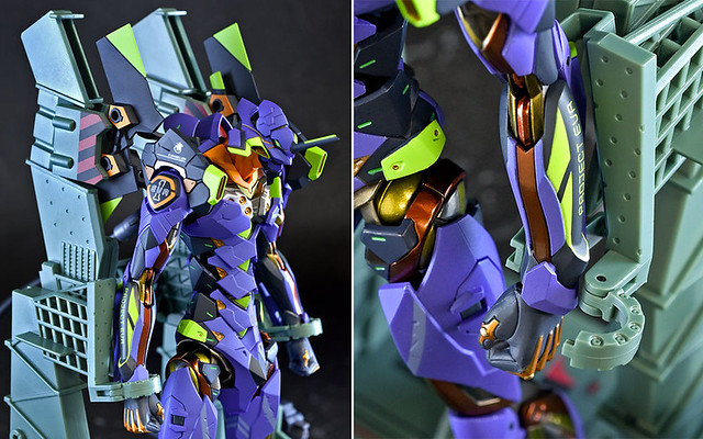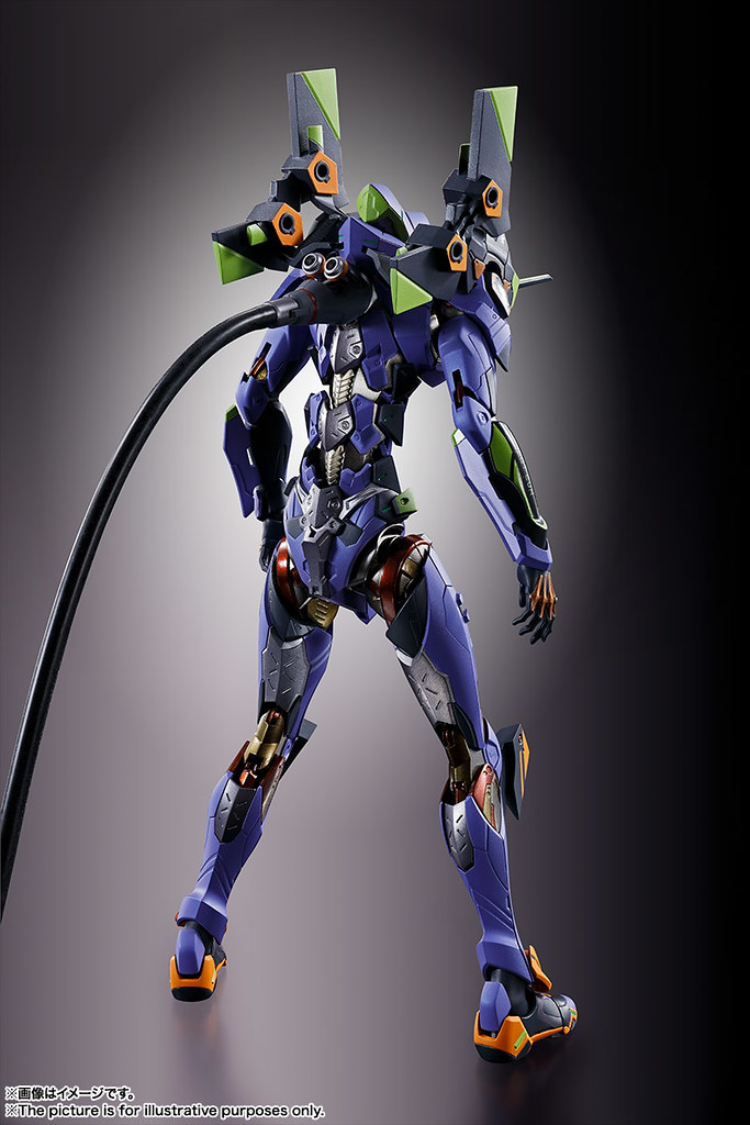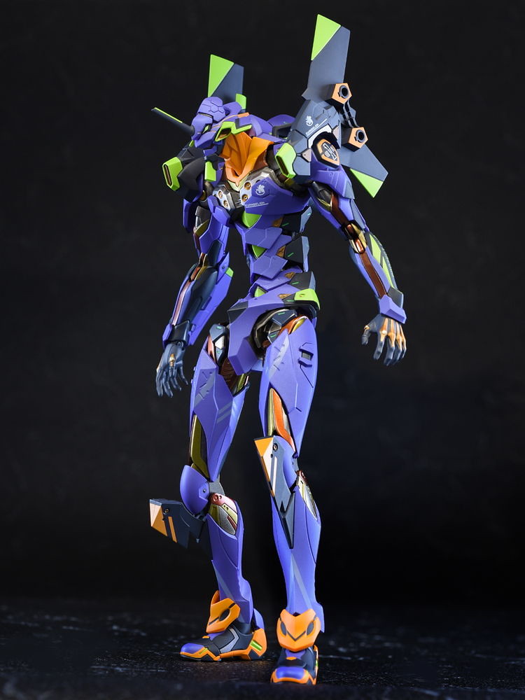 而關結構造則從高度可動的「ROBOT魂 EVA 系列」修改而來,髖關節採用全新設計、下顎也能展開。外部也追加了護目鏡、腰部武裝懸掛支架等裝備設計,讓初號機更像是「兵器」。將硬質感的裝甲、合金材質關節、複雜的設計構造集於一體,不論是拔刀、奔跑,甚至是粉絲們熟悉的暴走狀態都相當動感。