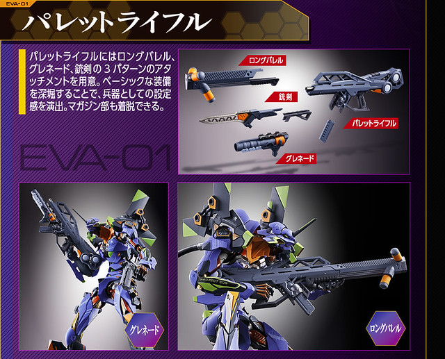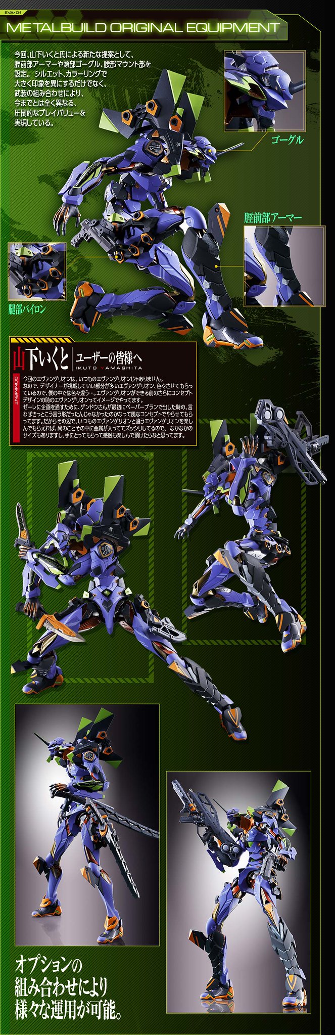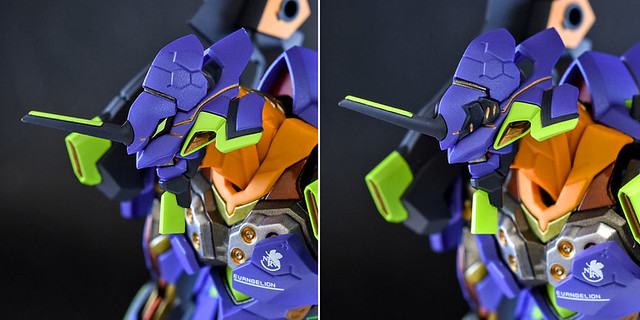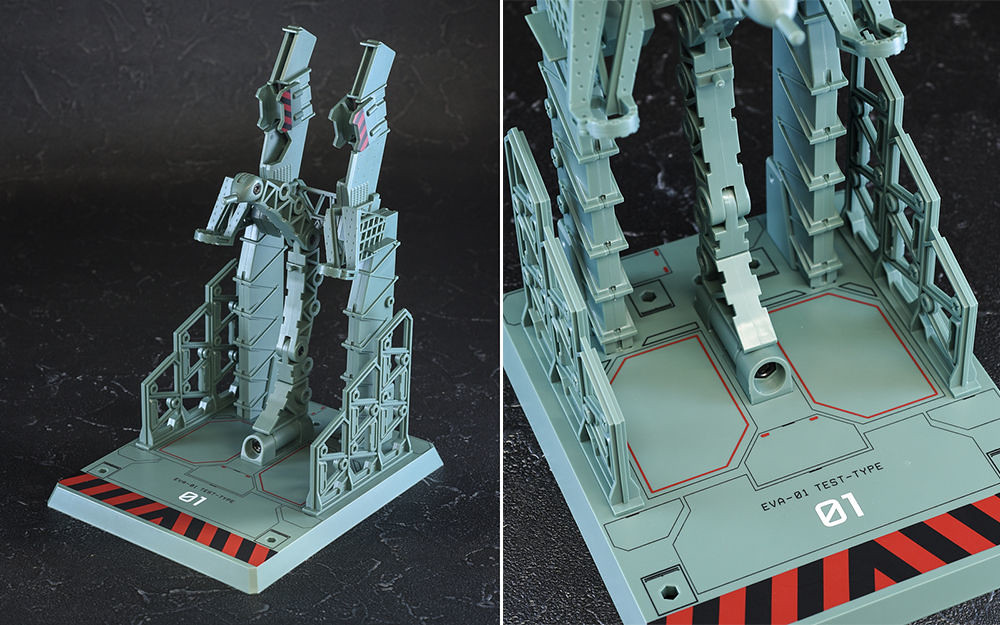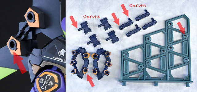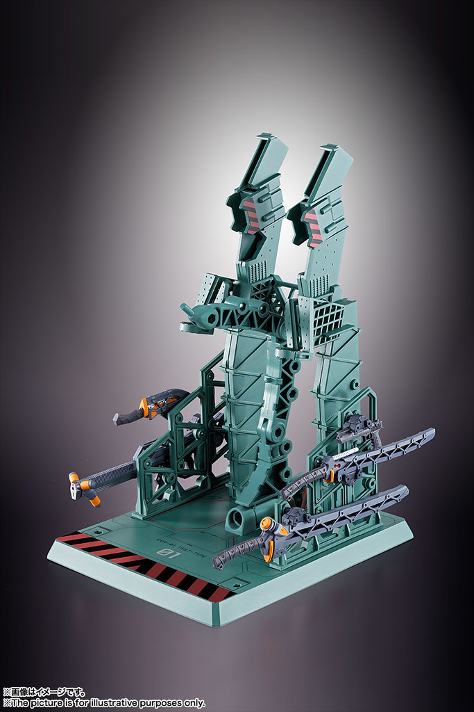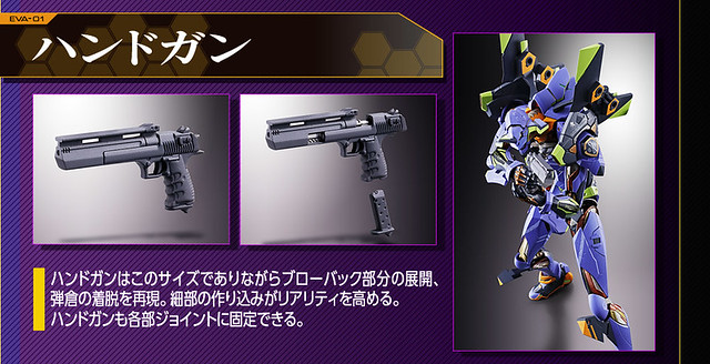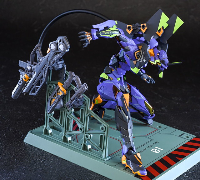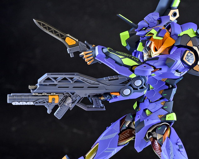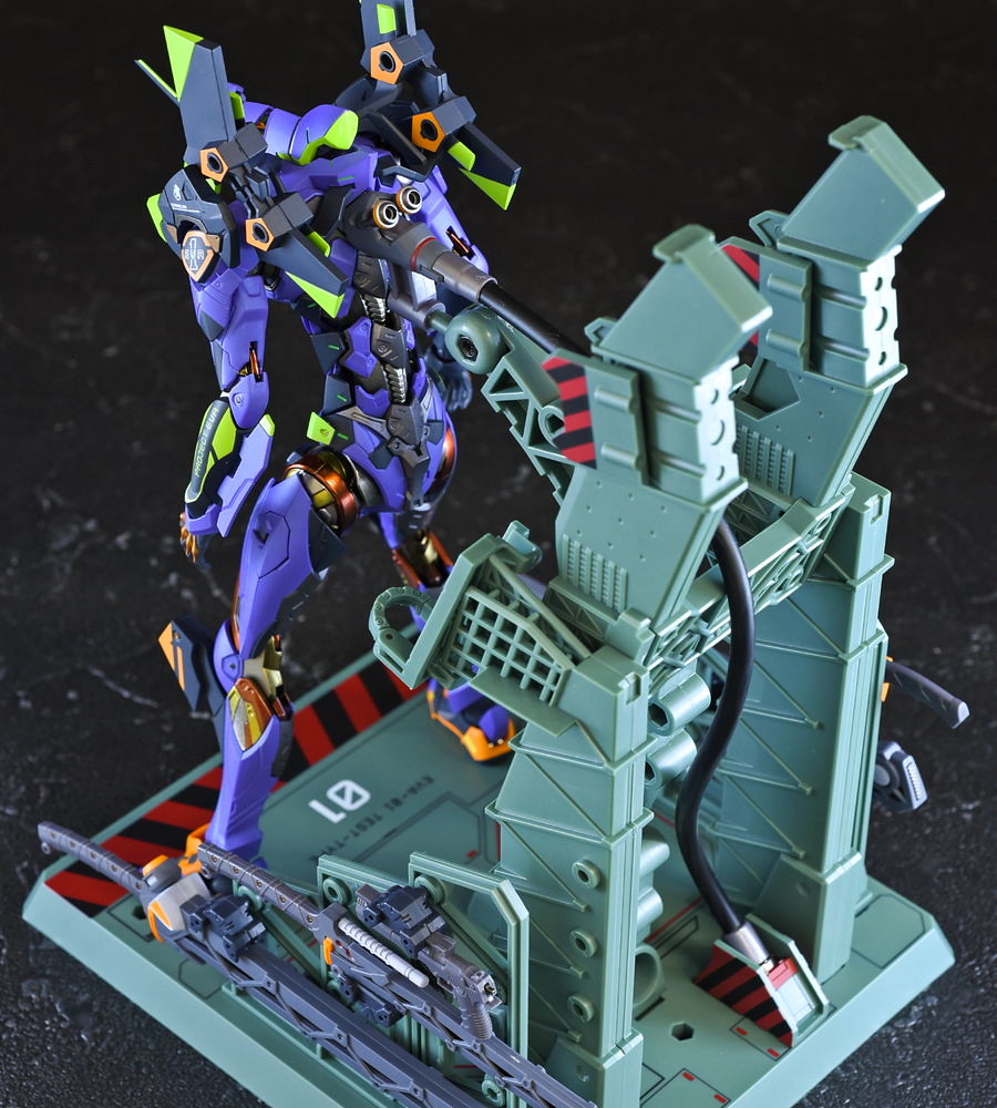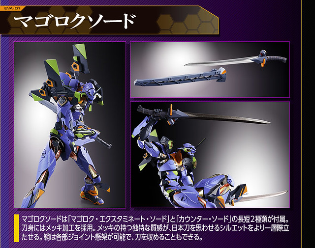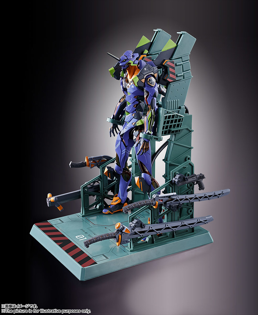 而關結構造則從高度可動的「ROBOT魂 EVA 系列」修改而來,髖關節採用全新設計、下顎也能展開。外部也追加了護目鏡、腰部武裝懸掛支架等裝備設計,讓初號機更像是「兵器」。將硬質感的裝甲、合金材質關節、複雜的設計構造集於一體,不論是拔刀、奔跑,甚至是粉絲們熟悉的暴走狀態都相當動感。
