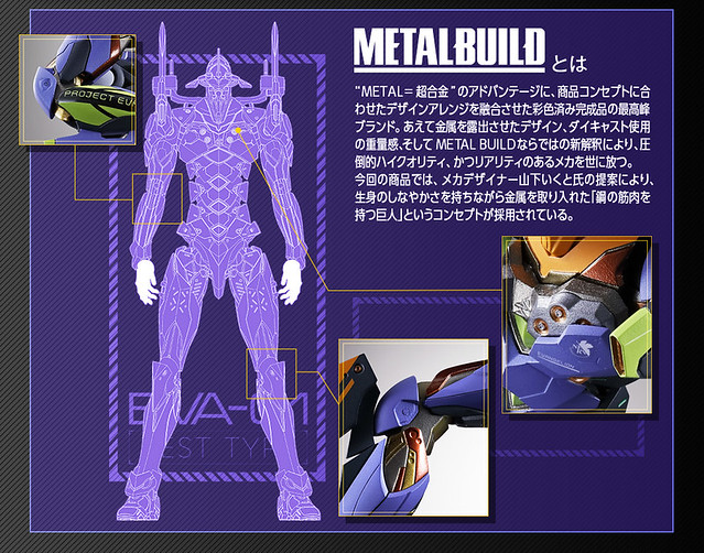 「METAL BUILD EVANGELION 初號機」由設計師山下育人(山下いくと)擔任設計,造型與過去各版本的 EVA 大不相同,以「擁有鋼鐵肌肉的巨人」的概念為發想並結合 METAL BUILD 系列特色,身形比例近似人體,手肘、髖部、膝蓋等多處關節使用合金材質製作,搭配細膩金屬色塗裝後,整體骨架、肌肉呈現多種金屬構成的機械質感,一改原作中由肉體構成的「人造人」印象。