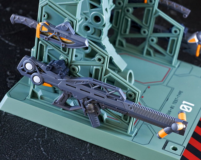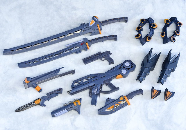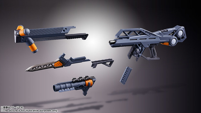 武裝部份收錄了步槍、手槍、高振動粒子刀、MAGOROKU E Sword、Counter Sword 等熟悉的武器,不過外型、機能都過大幅修改,各武裝都能掛載於格納庫造型底座、肩部裝甲、腰部武裝懸掛支架,自由搭配下讓造型更多元!