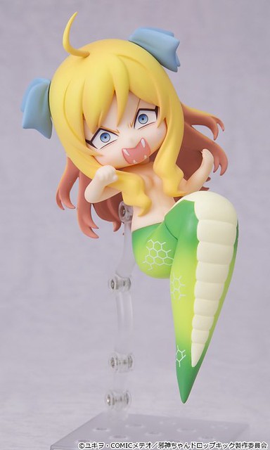 這次以《邪神與廚二病少女》電視動畫版本「邪神」造型來呈現,附有顏部配件有淘氣的「吐舌臉」、達到無我境界的「呆滯臉」、豎起寒毛的「邪神臉」等等,另外還有能重現日常情景的「邪碗」、「錢包」,以及附有「替換用下半身」與「出血」配件,還能重現邪神被切片的逗趣模樣,以及附必殺技「飛身踢用」配件等等,於GOOD SMILE COMPANY線上商店(グッスマオンライン)預購此作多附有特典「布丁(プリン)」,喜愛《邪神與廚二病少女》系列作品的玩具人可以參考一下歐!