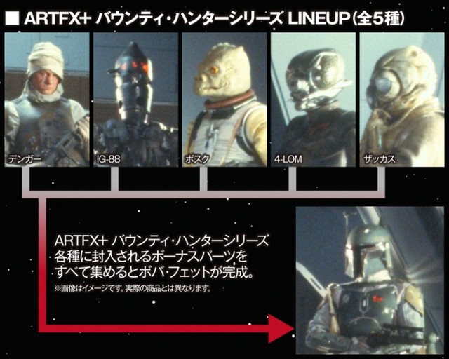 這個系列預計將推出有「登葛爾(デンガー)」、「刺客機器人IG-88(IG-88)」、「博斯克(ボスク)」、「4-LOM」和「扎庫斯(ザッカス)」等等五位賞金獵人,每一款都內附有另一位賞金獵人「波巴費特」的零件,只要收集五款角色就可以多獲得一個波巴費特的販售方式,喜愛《星際大戰》系列電影的玩具人可以參考一下歐!