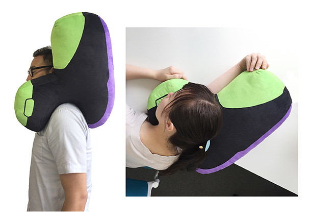 首先來看看造型相當奇葩的「EVA初號機肩膀抱枕」!這款抱枕以 EVA 初號機最突出的特徵「肩部」為原型,造型包含了前方正面的武器收納櫃、向上延伸的裝甲,下方的凹槽則能讓你剛好鑲在肩膀上,買兩個就能變身成初號機啦!不過這並不是主要功能,柔軟的 EVA 初號機肩膀抱枕能夠讓你在桌上、地上、船上安心睡眠,有人吵醒你還能馬上起床就暴走喔!