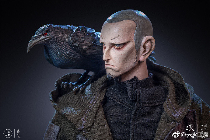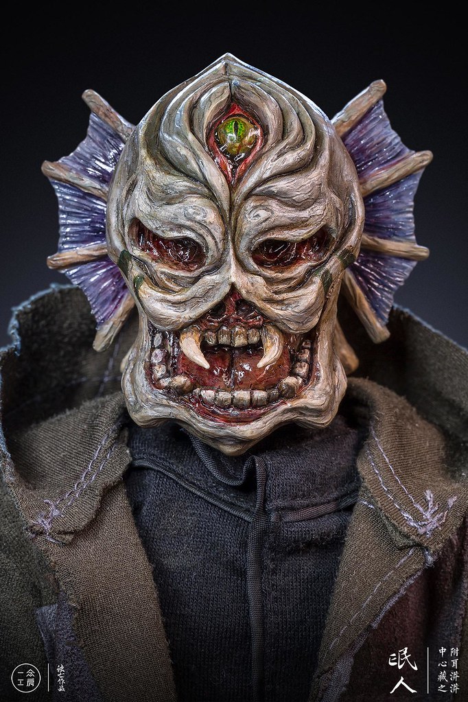 「氓人 1/6 比例人偶」頭雕展現出一念工房擅長的水墨風格,從眉毛、鬍子、鬢角,到眼神都有細膩的刻畫與上色,而布料的補丁大衣除了做出寫實的破損外,上頭也染滿了血跡,雖然骯髒破舊卻具有濃厚故事性,沒穿鞋子的雙腳纏著紗布富饒韻味~ 猙獰臉孔的面具散發出威懾、沈重的氛圍,漸層色彩甚至表現出活靈活現的生物感,配件包含大大的煙斗、布製煙袋、背架、斗笠、烏鴉和貓咪......等,而且連貓咪也有斗笠可以戴呢!