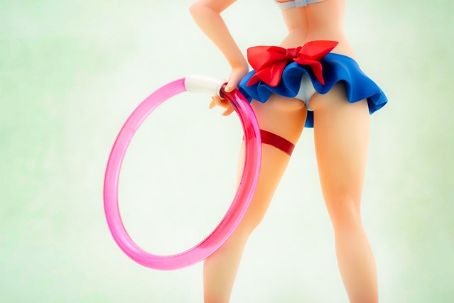 這款「阿蓮比 泳裝Ver. 1/7比例未塗裝GK套件」讓阿蓮比穿上與諾貝爾鋼彈相同的水手服造型泳裝,彷彿對著多門炫耀「怎麼樣?適合我嗎?」露出可愛的笑容與手勢,充滿了少女情懷,服裝細節的皺摺也相當細膩,左手則能替換為「光束緞帶」或「光束輪圈」兩種造型。