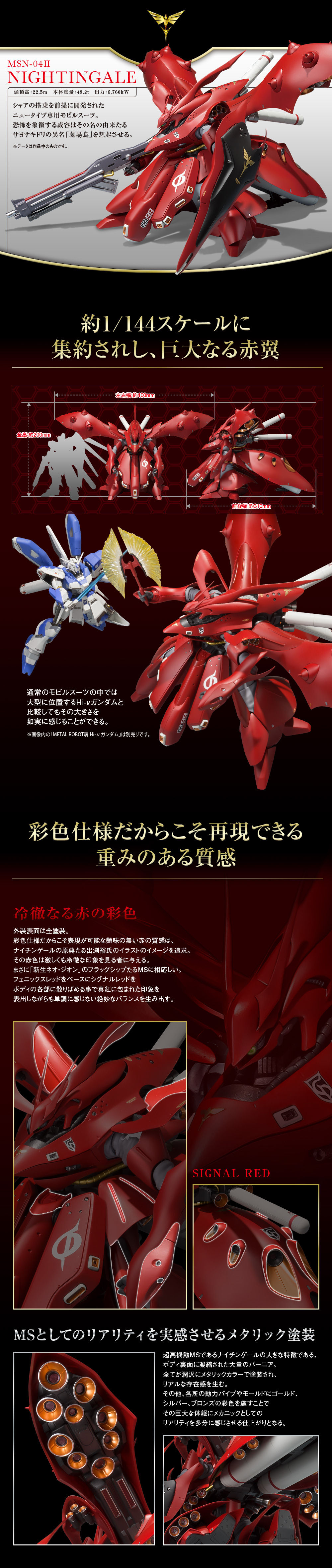 作為沙薩比的強化發展機,夜鶯的體型更為巨大,但機動性可不像外觀那樣遲鈍,全身裝設了大量的高推力推進噴嘴,並掛載共 5 基的大型燃料槽,機動力與續航力大幅提昇。大型的肩部則是取自MA「α‧ 阿吉爾」小型輕量化的產物,上頭搭載了 10 枚感應砲。看似不利近戰,但裙甲中卻藏有和「THE.O」相同的隱藏手臂,能使用光束軍刀奇襲對手,此外還有大型MEGA光束步槍、腹部的擴散MEGA粒子砲、光束戰斧等重火力光束武裝。