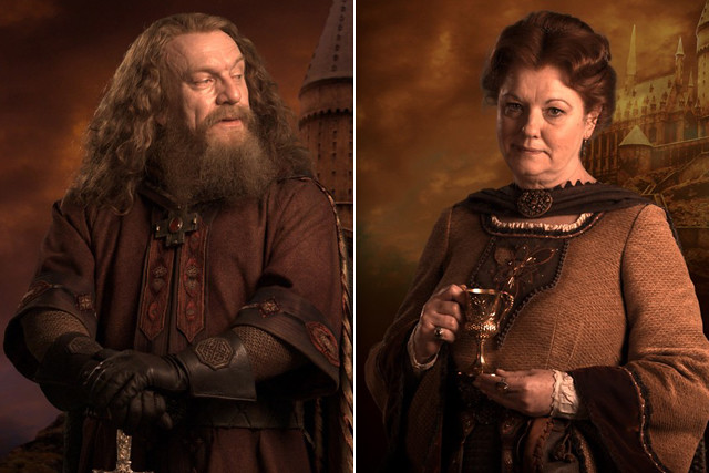 ▼《哈利波特》電影中設定造型的葛來分多學院創辦人:高錐客·葛來分多(左);赫夫帕夫學院創辦人:海加·赫夫帕夫(右)