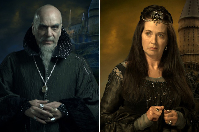 ▼《哈利波特》電影中設定造型的史萊哲林學院創辦人:薩拉札·史萊哲林(左);雷文克勞學院創辦人:羅威娜·雷文克勞(右)