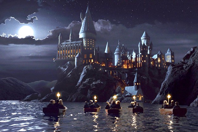 ▼霍格華茲一年級的新生乘坐霍格華茲特快車前往霍格華茲。在抵達活米村車站之後,會跟獵場看守一起乘坐小船穿過大湖,來到霍格華茲城堡的下面;接著在這之後,他們將會藉由分院儀式被分入不同的學院。