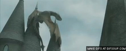 ▼在火盃的考驗中,三巫鬥法大賽的第一項任務是企圖從一隻龍的巢中拿到一個金蛋。 這一個場景出自於哈利挑戰時,匈牙利角尾龍掙脫了枷鎖,爬上屋頂企圖攻擊哈利的場景。