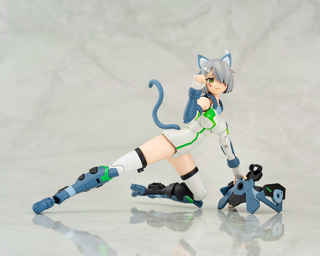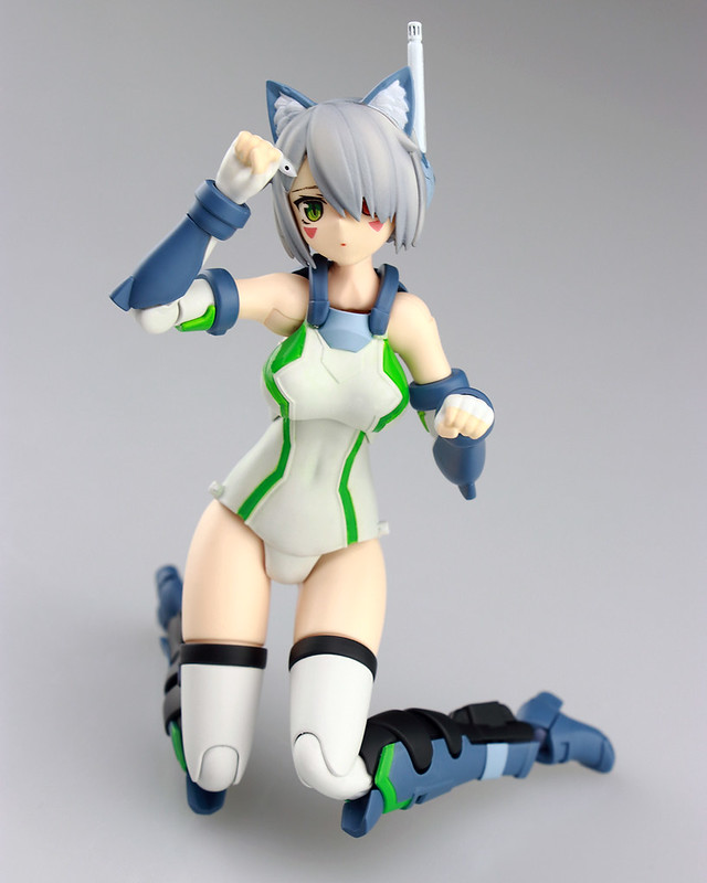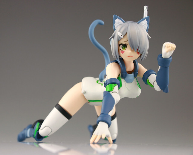 這次的作品將劇中凱厄斯拉格納支部 α、β、γ 小隊的主力量產機種「VF-31A 凱羅斯」機娘化,VF Girl 素體部份則設計成來自行星伏德爾的灰髮貓娘,對應凱羅斯的單眼機特色,貓娘有著斜瀏海遮住左眼、異色瞳孔等設定,還有一根細長的貓尾巴~能配合三種表情、露出雙眼的前髮零件把玩出可愛的模樣!