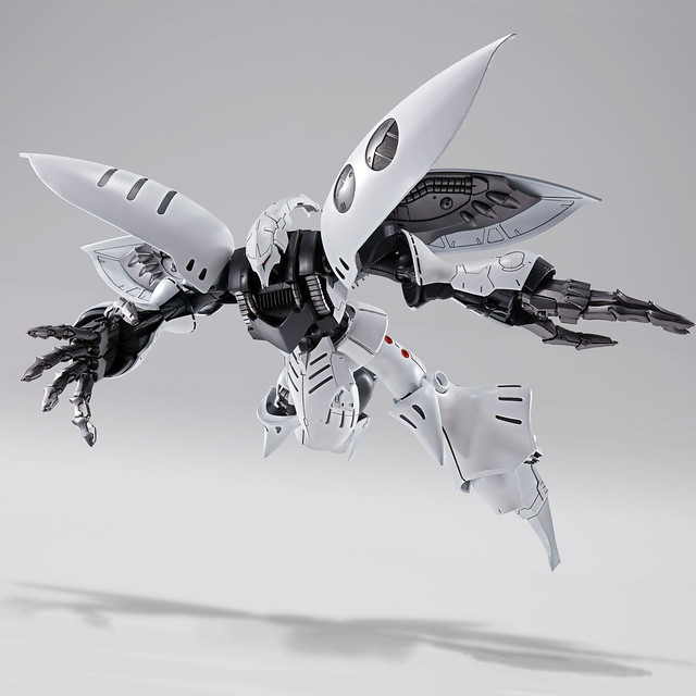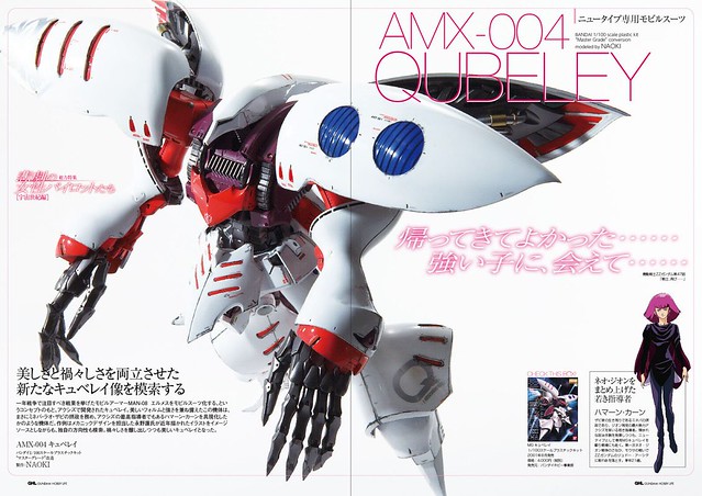 雖然這架「墮獄丘貝雷(キュベレイダムド)」目前尚未在外傳中登場,但有在關注 NAOKI 這位設計師的玩具人應該對它不陌生,早在 2014 年 NAOKI 就發表了這款由「MG 丘貝雷」改造而來的作品,同時也登上了雜誌《GUNDAM HOBBY LIFE》第五期的封面。NAOKI 在製作此機時參考了永野護老師自行重新設計的「MAN-103 丘貝雷」,造型有如利爪的巨大雙手是一大特徵。