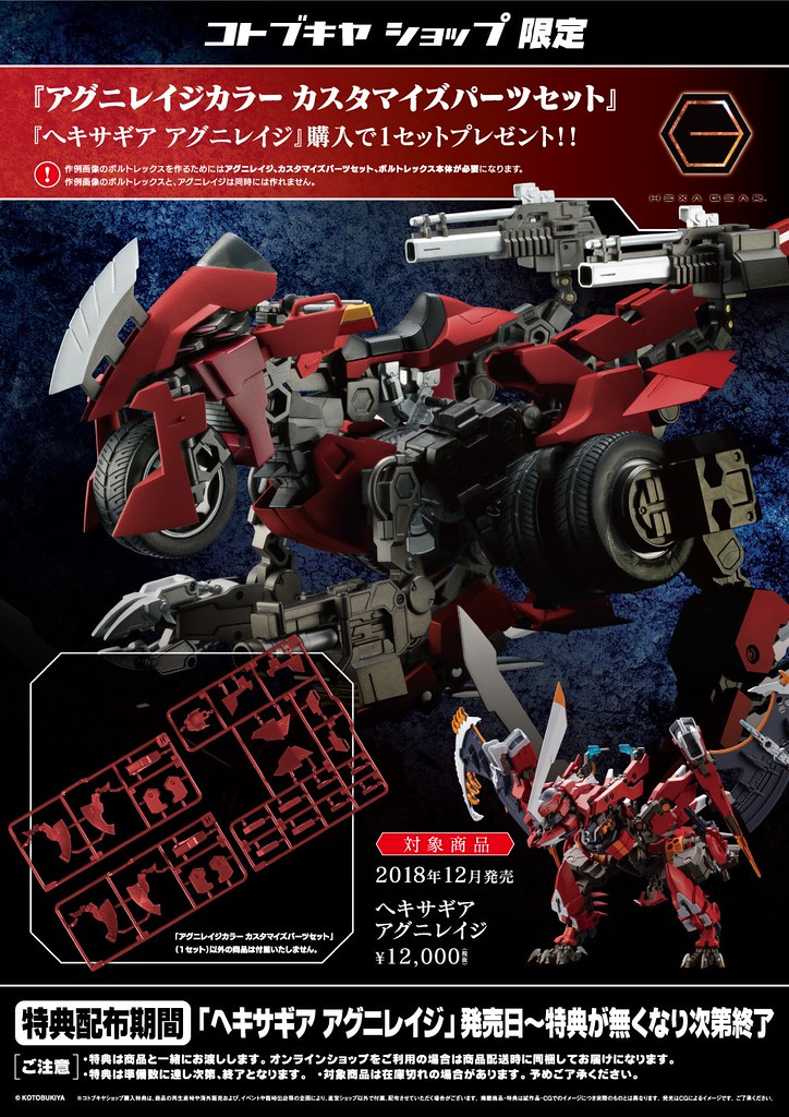 由日本壽屋玩具公司(KOTOBUKIYA)全新開發,具有極高自由度的組裝模型系列「HEXA GEAR(ヘキサギア)」今(28)日發表了最新商品「HEXAGEAR AGNIRAGE」預計於 2018 年 12 月發售的消息。